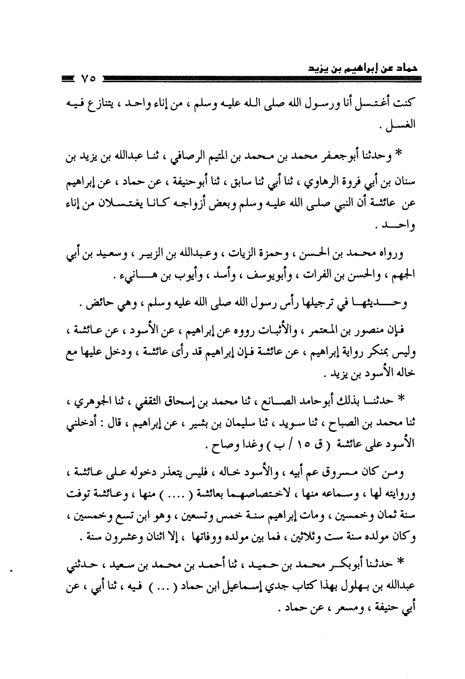 وَحَدَّثَنَا أَبُو جَعْفَرٍ مُحَمَّدُ بْنُ مُحَمَّدِ بْنِ الْمُتَيَّمِ الرُّصَافِيُّ، ثَنَا عَبْدُ اللَّهِ بْنُ يَزِيدَ بْنِ سِنَانِ بْنِ أَبِي فَرْوَةَ الرُّهَاوِيُّ، ثَنَا أَبِي، ثَنَا سَابِقٌ، ثَنَا أَبُو حَنِيفَةَ، عَنْ حَمَّادٍ، عَنْ إِبْرَاهِيمَ، عَنْ عَائِشَةَ: «أَنَّ النَّبِيَّ صَلَّى اللهُ عَلَيْهِ وَسَلَّمَ وَبَعْضَ أَزْوَاجِهِ §كَانَا يَغْتَسِلَانِ مِنْ إِنَاءٍ وَاحِدٍ» وَرَوَاهُ مُحَمَّدُ بْنُ الْحَسَنِ، وَحَمْزَةُ الزَّيَّاتُ، وَعَبْدُ اللَّهِ بْنُ الزُّبَيْرِ، وَسَعِيدُ بْنُ أَبِي الْجَهْمِ، وَالْحَسَنُ بْنُ الْفُرَاتِ، وَأَبُو يُوسُفَ، وَأَسَدٌ، وَأَيُّوبُ بْنُ هَانِئٍ، وَحَدِيثُهُا فِي تَرْجِيلِهَا رَأْسَ رَسُولِ اللَّهِ صَلَّى اللهُ عَلَيْهِ وَسَلَّمَ وَهِيَ حَائِضٌ، فَإِنَّ مَنْصُورَ بْنَ الْمُعْتَمِرِ وَالْأَثْبَاتَ رَوَوْهُ عَنْ إِبْرَاهِيمَ، عَنِ الْأَسْوَدِ، عَنْ عَائِشَةَ، وَلَيْسَ بِمُنْكَرٍ رِوَايَةُ إِبْرَاهِيمَ عَنْ عَائِشَةَ، فَإِنَّ إِبْرَاهِيمَ قَدْ رَأَى عَائِشَةَ، وَدَخَلَ عَلَيْهَا مَعَ خَالِهِ الْأَسْوَدِ بْنِ يَزِيدَ