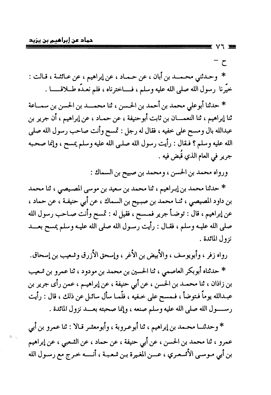 حَدَّثَنَا مُحَمَّدُ بْنُ إِبْرَاهِيمَ، ثَنَا مُحَمَّدُ بْنُ سَعِيدِ بْنِ مُوسَى الْمِصِّيصِيُّ، ثَنَا مُحَمَّدُ بْنُ دَاوُدَ الْمِصِّيصِيُّ، ثَنَا مُحَمَّدُ بْنُ صُبَيْحِ بْنِ السَّمَّاكِ، عَنْ أَبِي حَنِيفَةَ، عَنْ حَمَّادٍ، عَنْ إِبْرَاهِيمَ، قَالَ: تَوَضَّأَ جَرِيرٌ فَمَسَحَ، فَقِيلَ لَهُ: تَمْسَحُ وَأَنْتَ صَاحِبُ رَسُولِ اللَّهِ صَلَّى اللهُ عَلَيْهِ وَسَلَّمَ؟ فَقَالَ: «§رَأَيْتُ رَسُولَ اللَّهِ صَلَّى اللهُ عَلَيْهِ وَسَلَّمَ يَمْسَحُ بَعْدَ نُزُولِ الْمَائِدَةِ» رَوَاهُ زُفَرُ، وَأَبُو يُوسُفَ، وَالْأَبْيَضُ بْنُ الْأَغَرِّ، وَإِسْحَاقُ الْأَزْرَقُ، وَشُعَيْبُ بْنُ إِسْحَاقَ