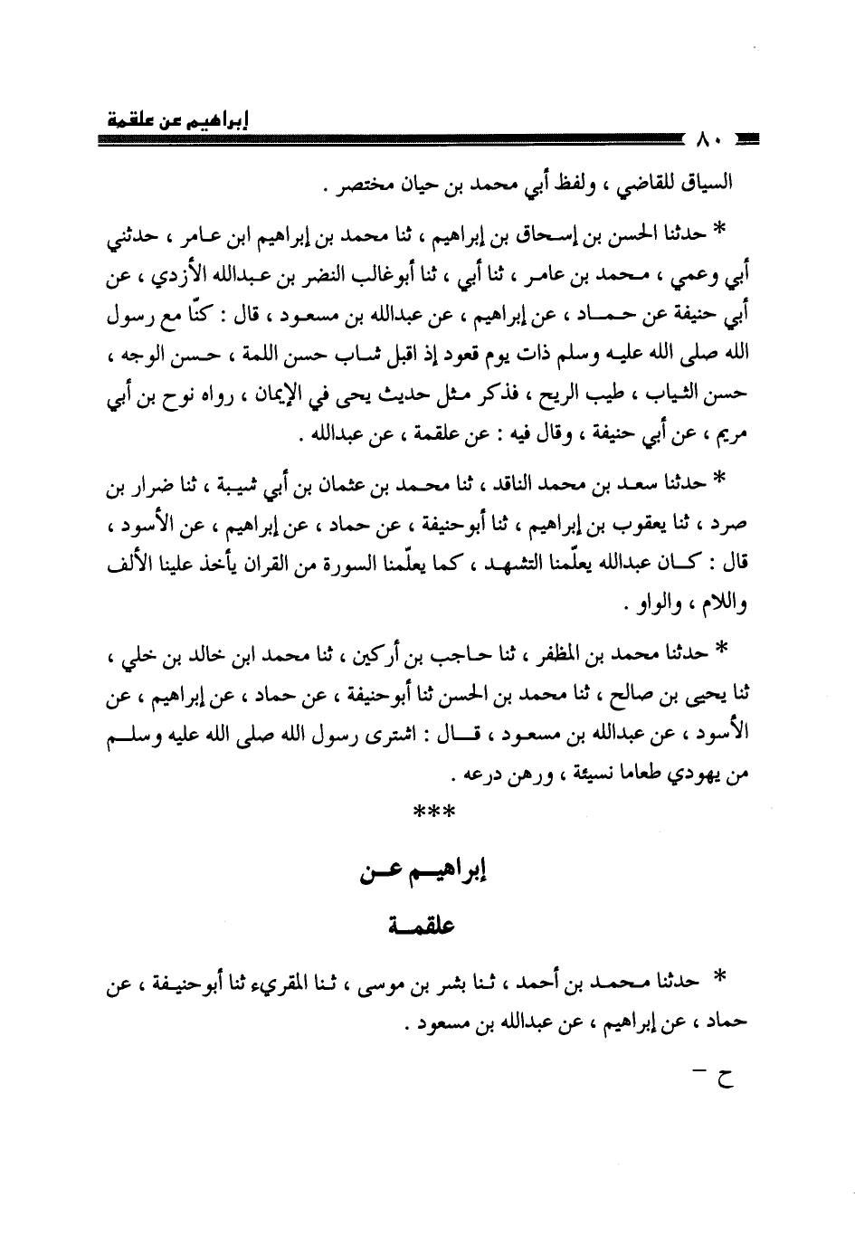 حَدَّثَنَا سَعْدُ بْنُ مُحَمَّدِ بْنِ النَّاقِدِ بْنِ عُثْمَانَ بْنِ أَبِي شَيْبَةَ، ثَنَا ضِرَارُ بْنُ صُرَدٍ، ثَنَا يَعْقُوبُ بْنُ إِبْرَهِيمَ، ثَنَا أَبُو حَنِيفَةَ، عَنْ حَمَّادٍ، عَنْ إِبْرَاهِيمَ، عَنِ الْأَسْوَدِ، قَالَ: «كَانَ عَبْدُ اللَّهِ §يُعَلِّمُنَا التَّشَهُّدَ كَمَا يُعَلِّمُنَا السُّورَةَ مِنَ الْقُرْآنِ، يَأْخُذُ عَلَيْنَا الْأَلِفَ، وَاللَّامَ، وَالْوَاوَ»