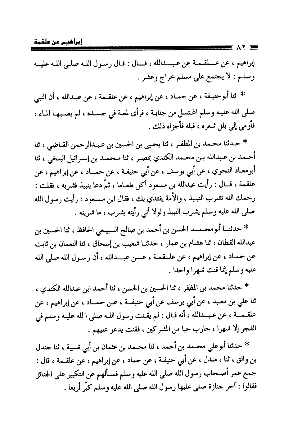 ثَنَا أَبُو حَنِيفَةَ، عَنْ حَمَّادٍ، عَنْ إِبْرَاهِيمَ، عَنْ عَلْقَمَةَ، عَنْ عَبْدِ اللَّهِ: «أَنَّ النَّبِيَّ صَلَّى اللهُ عَلَيْهِ وَسَلَّمَ §اغْتَسَلَ مِنْ جَنَابَةٍ فَرَأَى لُمْعَةً فِي جَسَدِهِ لَمْ يُصِبْهَا الْمَاءُ فَأَوْمَى إِلَى بَلَلِ شَعْرِهِ فَبَلَّهُ فَأَجْزَاهُ ذَلِكَ»