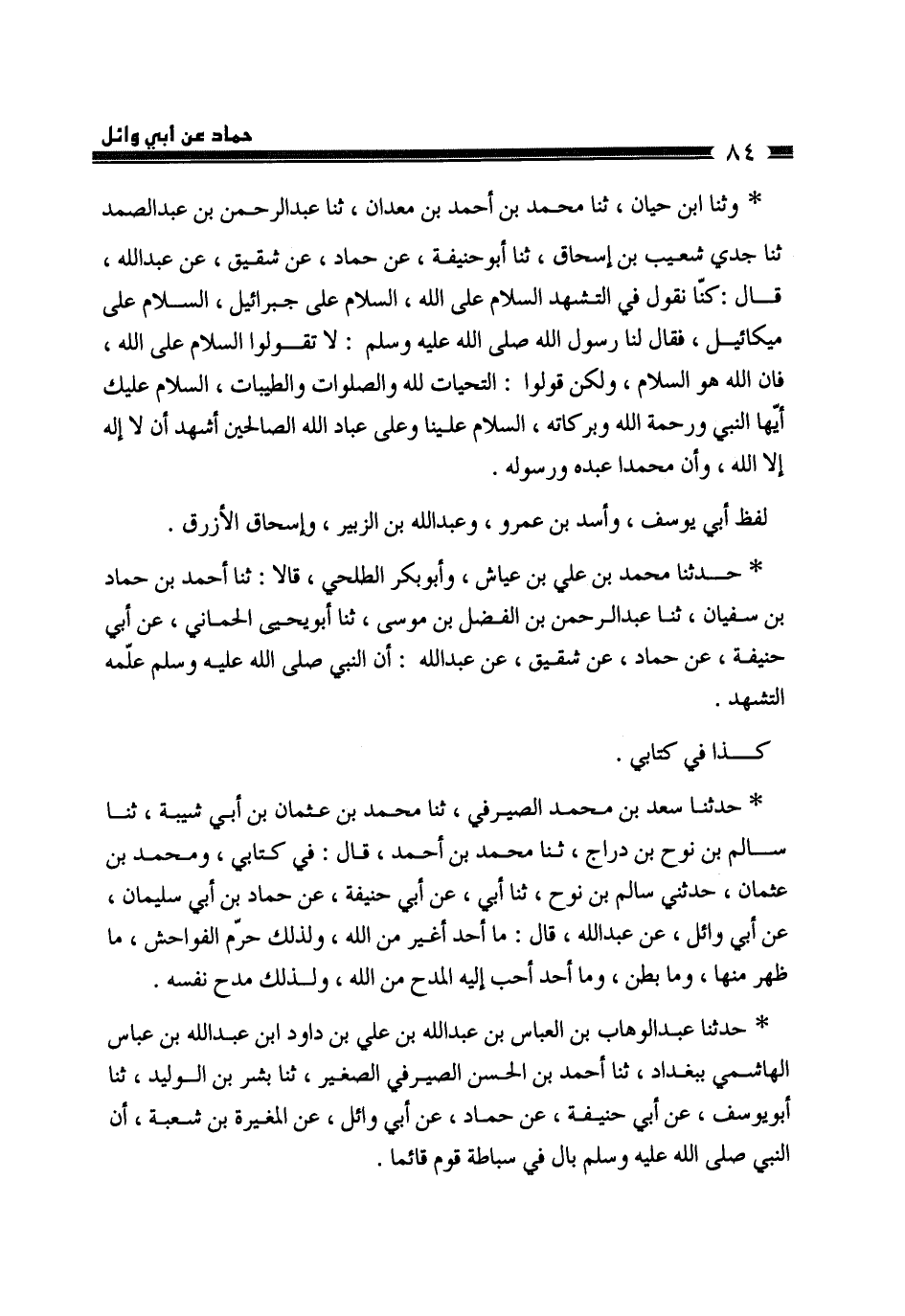 حَدَّثَنَا مُحَمَّدُ بْنُ عَلِيِّ بْنِ عَيَّاشٍ، وَأَبُو بَكْرٍ الطَّلْحِيُّ قَالَا: ثَنَا أَحْمَدُ بْنُ حَمَّادِ بْنِ سُفْيَانَ، ثَنَا عَبْدُ الرَّحْمَنِ بْنُ الْفَضْلِ بْنِ مُوسَى، ثَنَا أَبُو يَحْيَى الْحِمَّانِيُّ، عَنْ أَبِي حَنِيفَةَ، عَنْ حَمَّادٍ، عَنْ شَقِيقٍ، عَنْ عَبْدِ اللَّهِ، «§أَنَّ النَّبِيَّ صَلَّى اللهُ عَلَيْهِ وَسَلَّمَ عَلَّمَهُ التَّشَهُّدَ» كَذَا فِي كِتَابِي