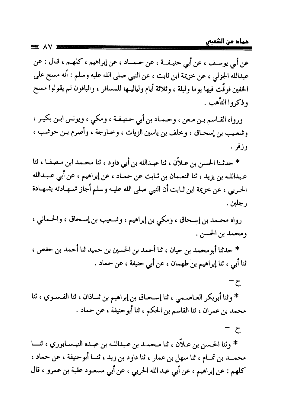حَدَّثَنَا الْحَسَنُ بْنُ عَلَّانَ، ثَنَا عَبْدُ اللَّهِ بْنُ أَبِي دَاوُدَ، ثَنَا مُحَمَّدُ بْنُ مُصَفَّى، ثَنَا عَبْدُ اللَّهِ بْنُ يَزِيدَ، ثَنَا النُّعْمَانُ بْنُ ثَابِتٍ، عَنْ حَمَّادٍ، عَنْ إِبْرَاهِيمَ، عَنْ أَبِي عَبْدِ اللَّهِ الْجَدَلِيِّ، عَنْ خُزَيْمَةَ بْنِ ثَابِتٍ: «أَنَّ النَّبِيَّ صَلَّى اللهُ عَلَيْهِ وَسَلَّمَ §أَجَازَ شَهَادَتَهُ بِشَهَادَةِ رَجُلَيْنِ» رَوَاهُ مُحَمَّدُ بْنُ إِسْحَاقَ، وَمَكِّيُّ بْنُ إِبْرَاهِيمَ، وَشُعَيْبُ بْنُ إِسْحَاقَ، وَالْحِمَّانِيُّ، وَمُحَمَّدُ بْنُ الْحَسَنِ