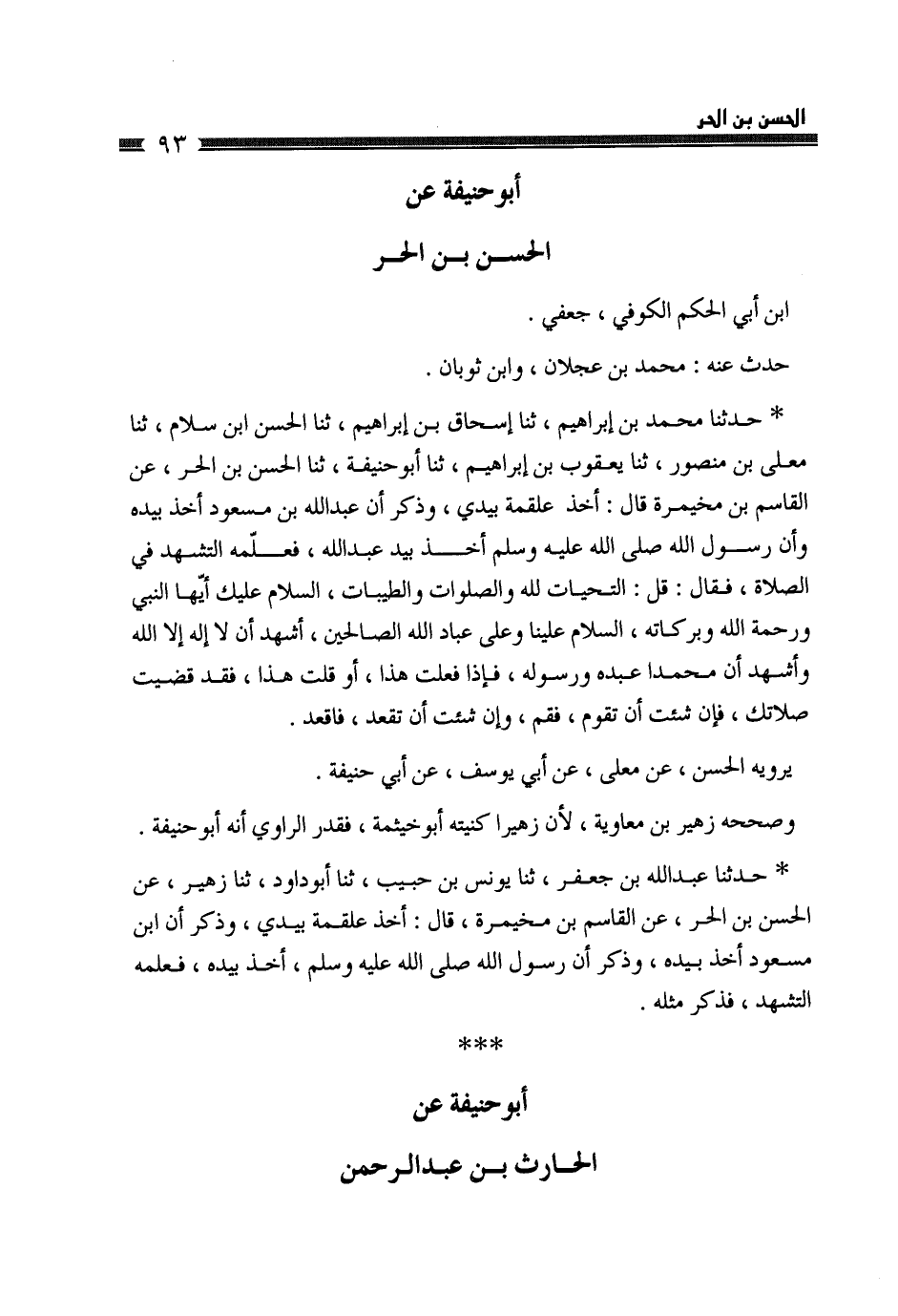 §أَبُو حَنِيفَةَ، عَنِ الْحَارِثِ بْنِ عَبْدِ الرَّحْمَنِ -[94]- الْهَمْدَانِيِّ أَبِي هِنْدٍ وَيُقَالُ: هُوَ النَّخَعِيُّ أَخُو سَلْمٍ