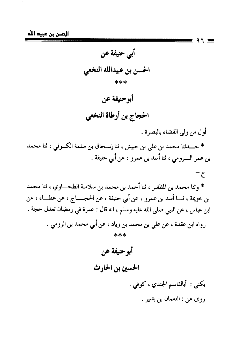 §أَبُو حَنِيفَةَ، عَنِ الْحُسَيْنِ بْنِ الْحَارِثِ يُكْنَى أَبَا الْقَاسِمِ الْجَنَدِيَّ، كُوفِيٌّ، رَوَى عَنِ النُّعْمَانِ بْنِ بَشِيرٍ