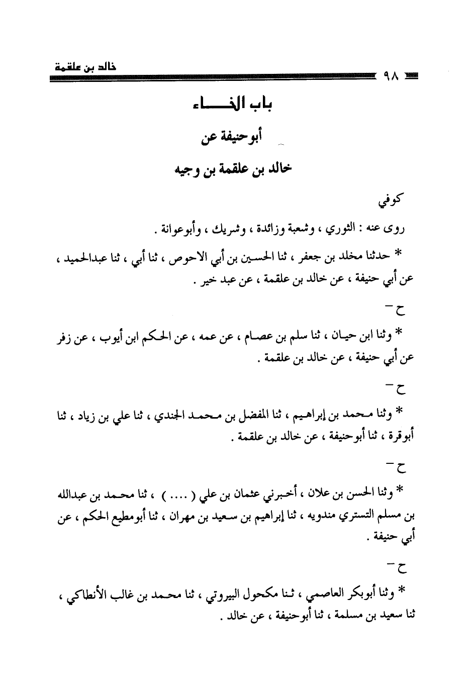 §أَبُو حَنِيفَةَ، عَنْ خَالِدِ بْنِ عَلْقَمَةَ بْنِ وَجِيهٍ كُوفِيٌّ، رَوَى عَنْهُ الثَّوْرِيُّ، وَشُعْبَةُ، وَزَائِدَةُ، وَشَرِيكٌ، وَأَبُو عَوَانَةَ