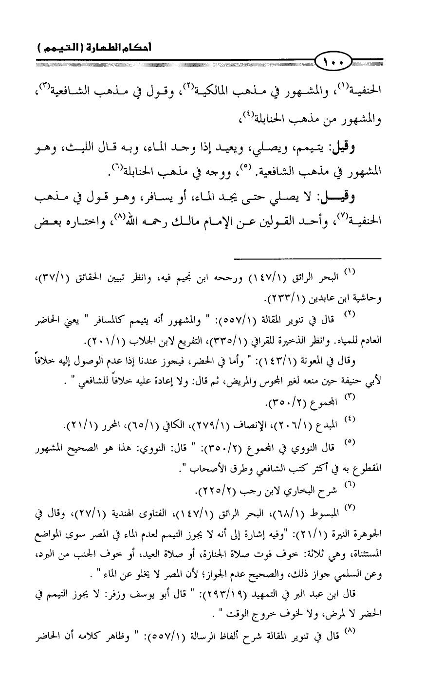 (¬٢) قال في تنوير المقالة (١/ ٥٥٧): " والمشهور أنه يتيمم كالمسافر " يعني الحاضر العادم للمياه. وانظر الذخيرة للقرافي (١/ ٣٣٥)، التفريع لابن الجلاب (١/ ٢٠١).