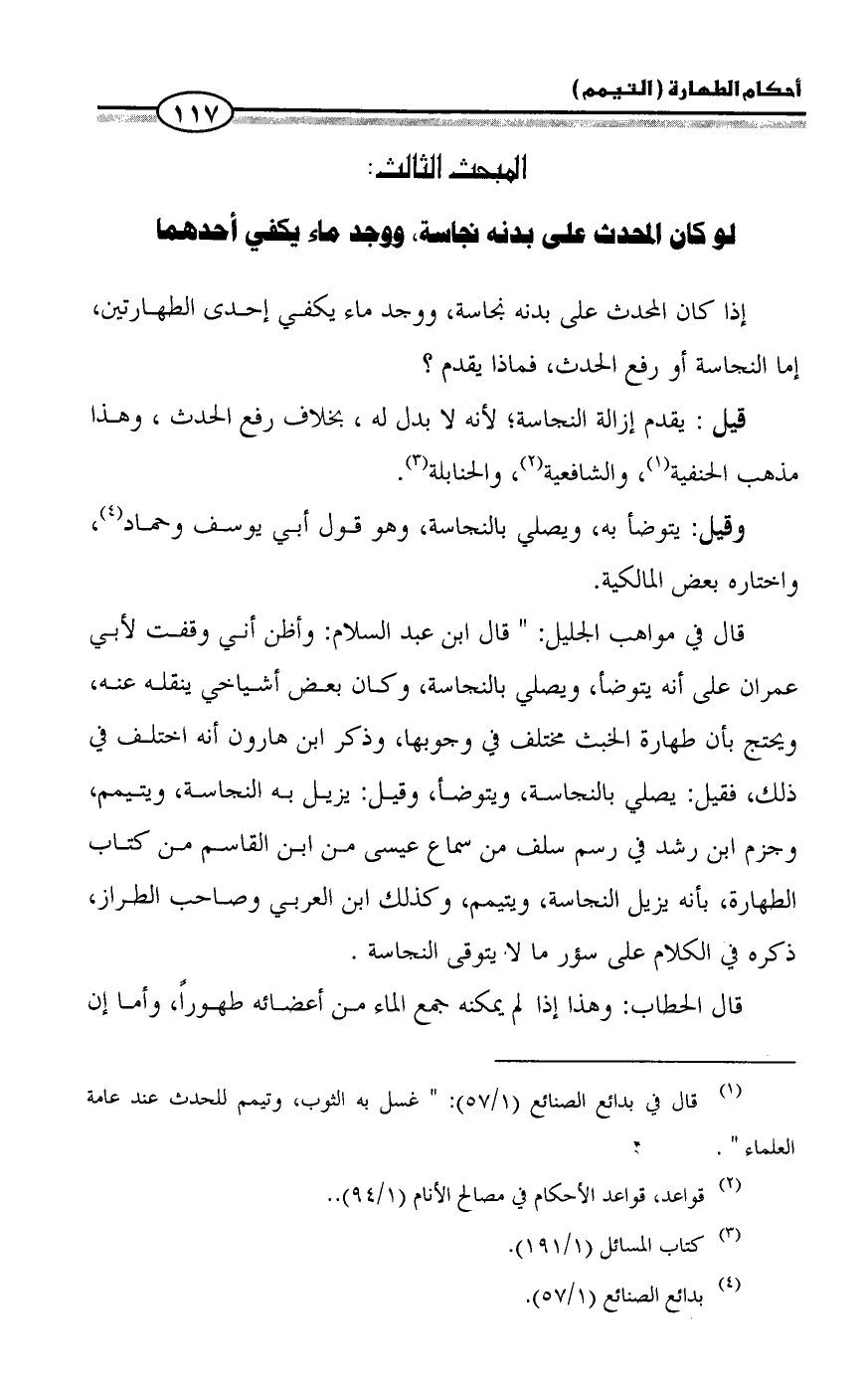 قال في مواهب الجليل: " قال ابن عبد السلام: وأظن أني وقفت لأبي عمران على أنه يتوضأ، ويصلي بالنجاسة، وكان بعض أشياخي ينقله عنه، ويحتج بأن طهارة الخبث مختلف في وجوبها، وذكر ابن هارون أنه اختلف في ذلك، فقيل: يصلي بالنجاسة، ويتوضأ، وقيل: يزيل به النجاسة، ويتيمم، وجزم ابن رشد في رسم سلف من سماع عيسى من ابن القاسم من كتاب الطهارة، بأنه يزيل النجاسة، ويتيمم، وكذلك ابن العربي وصاحب الطراز، ذكره في الكلام على سؤر ما لا يتوقى النجاسة.