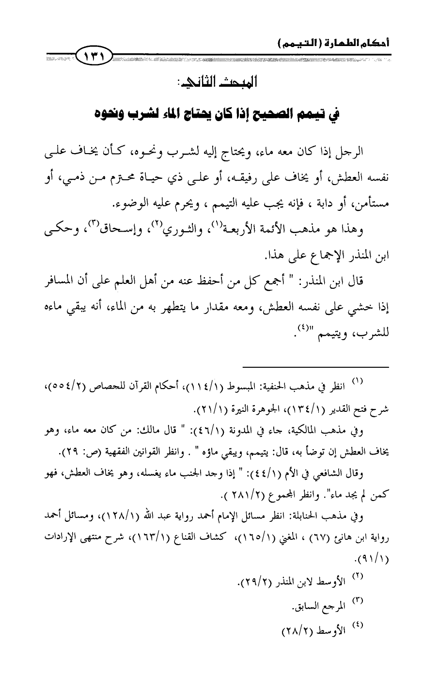 قال ابن المنذر: " أجمع كل من أحفظ عنه من أهل العلم على أن المسافر إذا خشي على نفسه العطش، ومعه مقدار ما يتطهر به من الماء، أنه يبقي ماءه للشرب، ويتيمم " (¬٤).
