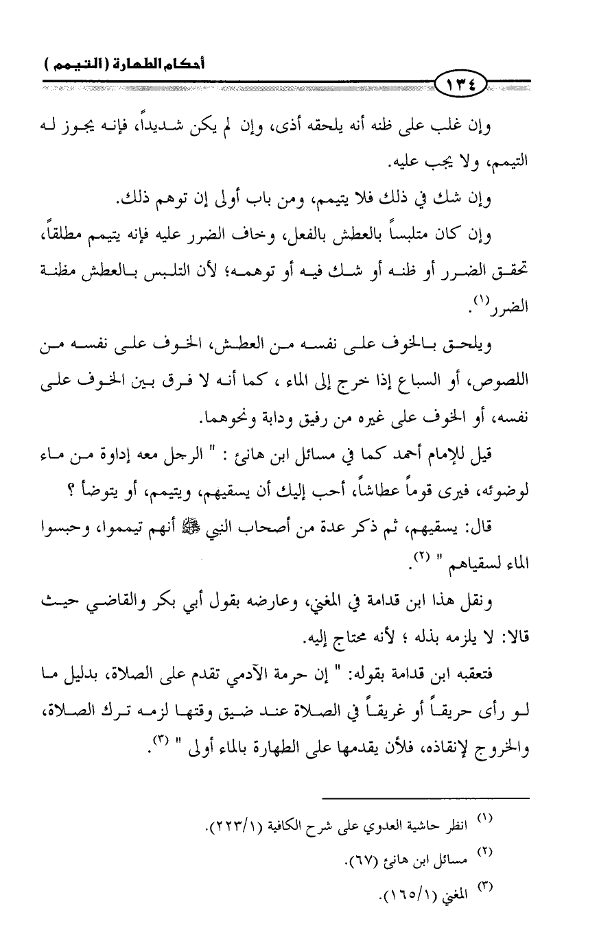 فتعقبه ابن قدامة بقوله: " إن حرمة الآدمي تقدم على الصلاة، بدليل ما لو رأى حريقاً أو غريقاً في الصلاة عند ضيق وقتها لزمه ترك الصلاة، والخروج لإنقاذه، فلأن يقدمها على الطهارة بالماء أولى " (¬٣).