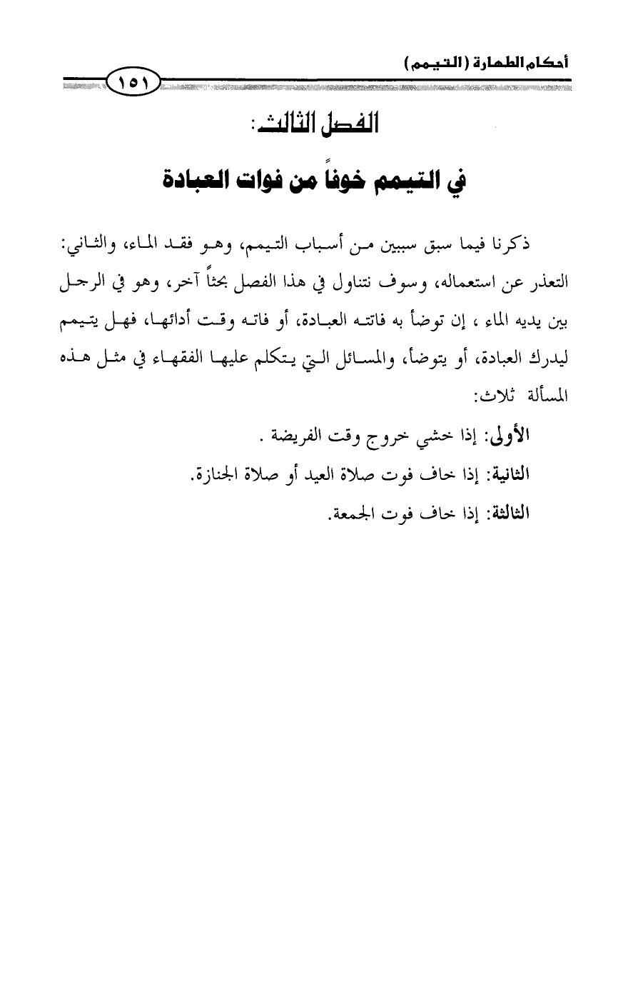 ذكرنا فيما سبق سببين من أسباب التيمم، وهو فقد الماء، والثاني: التعذر عن استعماله، وسوف نتناول في هذا الفصل بحثاً آخر، وهو في الرجل بين يديه الماء، إن توضأ به فاتته العبادة، أو فاته وقت أدائها، فهل يتيمم ليدرك العبادة، أو يتوضأ، والمسائل التي يتكلم عليها الفقهاء في مثل هذه المسألة ثلاث: