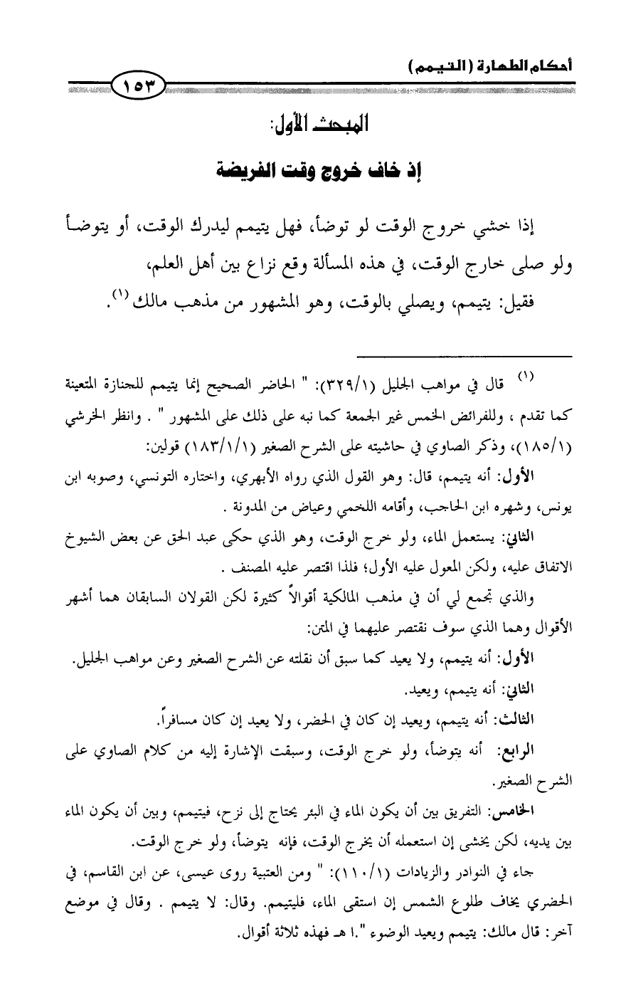 (¬١) قال في مواهب الجليل (١/ ٣٢٩): " الحاضر الصحيح إنما يتيمم للجنازة المتعينة كما تقدم، وللفرائض الخمس غير الجمعة كما نبه على ذلك على المشهور ". وانظر الخرشي (١/ ١٨٥)، وذكر الصاوي في حاشيته على الشرح الصغير (١/ ١/١٨٣) قولين: