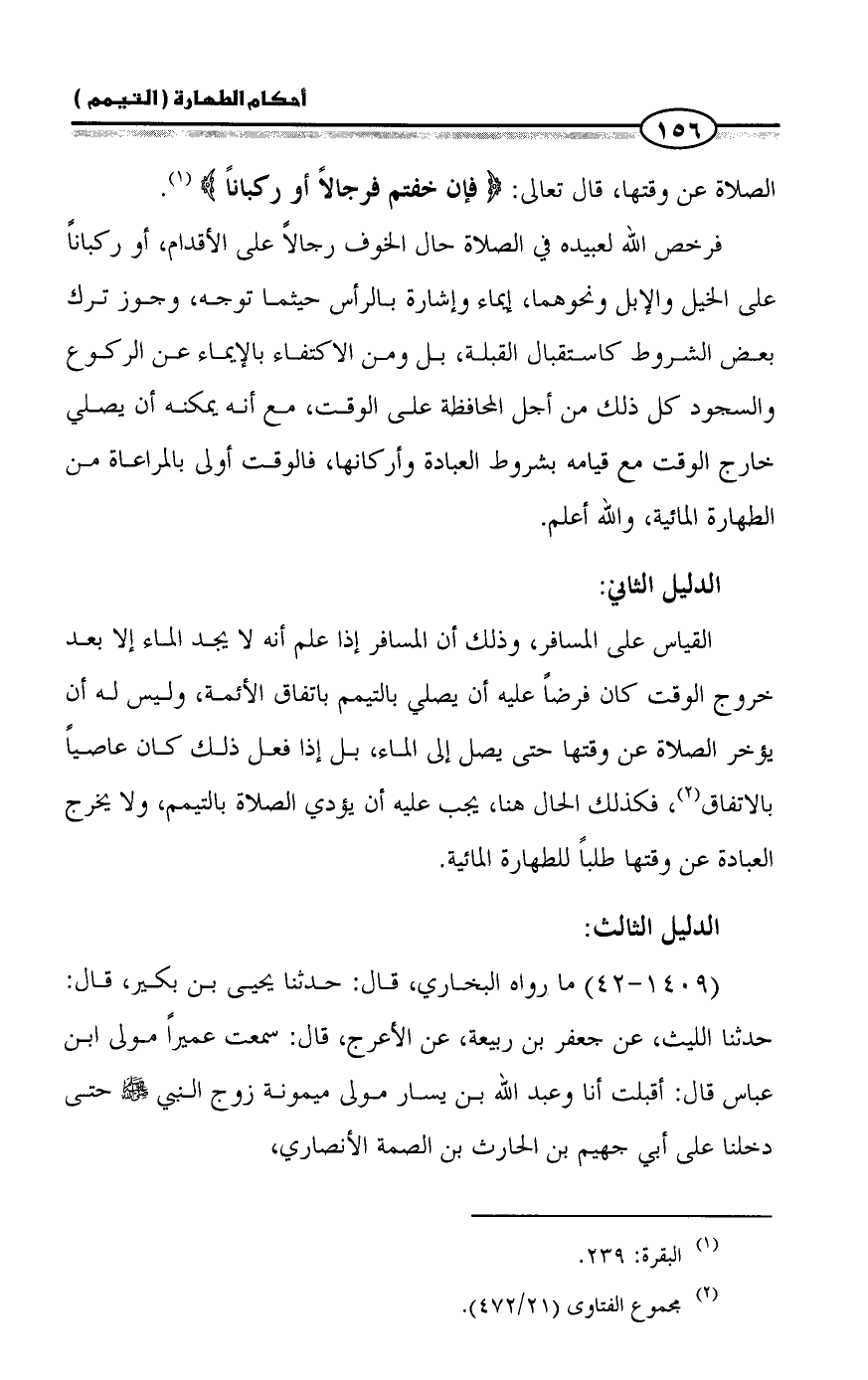 (١٤٠٩ - ٤٢) ما رواه البخاري، قال: حدثنا يحيى بن بكير، قال: حدثنا الليث، عن جعفر بن ربيعة، عن الأعرج، قال: سمعت عميراً مولى ابن عباس قال: أقبلت أنا وعبد الله بن يسار مولى ميمونة زوج النبي - صلى الله عليه وسلم - حتى دخلنا على أبي جهيم بن الحارث بن الصمة الأنصاري،
