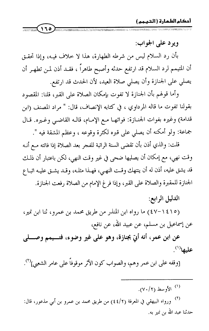 بأن رد السلام ليس من شرطه الطهارة، هذا لا خلاف فيه، وإذا تحقق أن المتيمم لرد السلام قد ارتفع حدثه وأصبح طاهراً، فقد أذن لمن تطهر أن يصلي على الجنازة وأن يصلي صلاة العيد، لأن الحدث قد ارتفع.