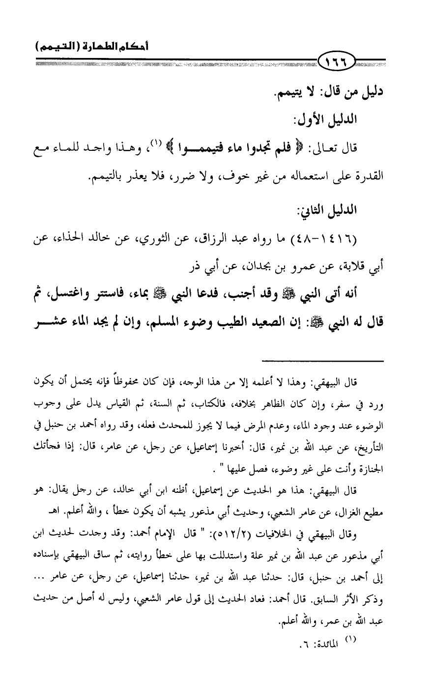 (١٤١٦ - ٤٨) ما رواه عبد الرزاق، عن الثوري، عن خالد الحذاء، عن أبي قلابة، عن عمرو بن بجدان، عن أبي ذر أنه أتى النبي - صلى الله عليه وسلم - وقد أجنب، فدعا النبي - صلى الله عليه وسلم - بماء، فاستتر واغتسل، ثم قال له النبي - صلى الله عليه وسلم -: إن الصعيد الطيب وضوء المسلم، وإن لم يجد الماء عشر