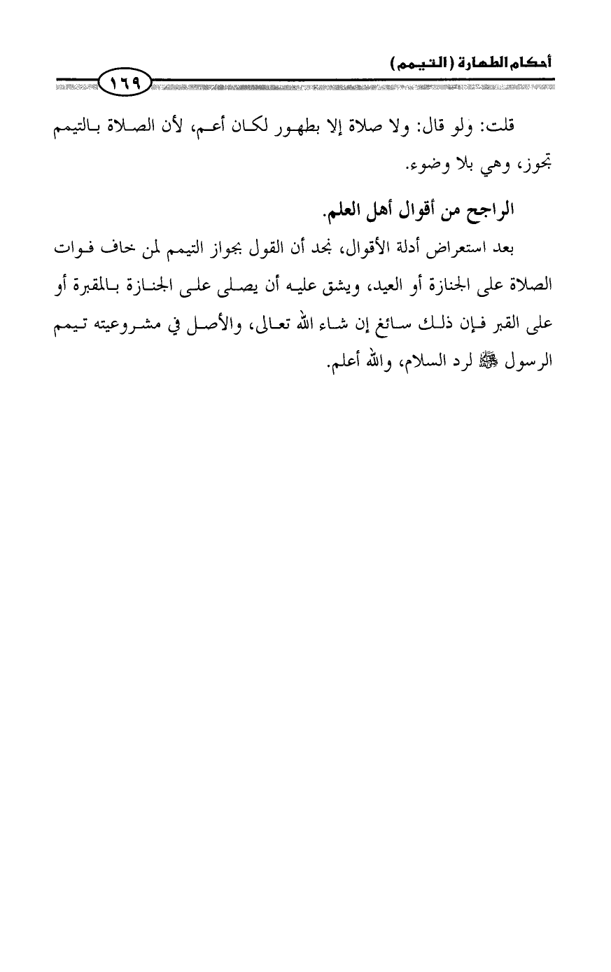 بعد استعراض أدلة الأقوال، نجد أن القول بجواز التيمم لمن خاف فوات الصلاة على الجنازة أو العيد، ويشق عليه أن يصلى على الجنازة بالمقبرة أو على القبر فإن ذلك سائغ إن شاء الله تعالى، والأصل في مشروعيته تيمم الرسول - صلى الله عليه وسلم - لرد السلام، والله أعلم.