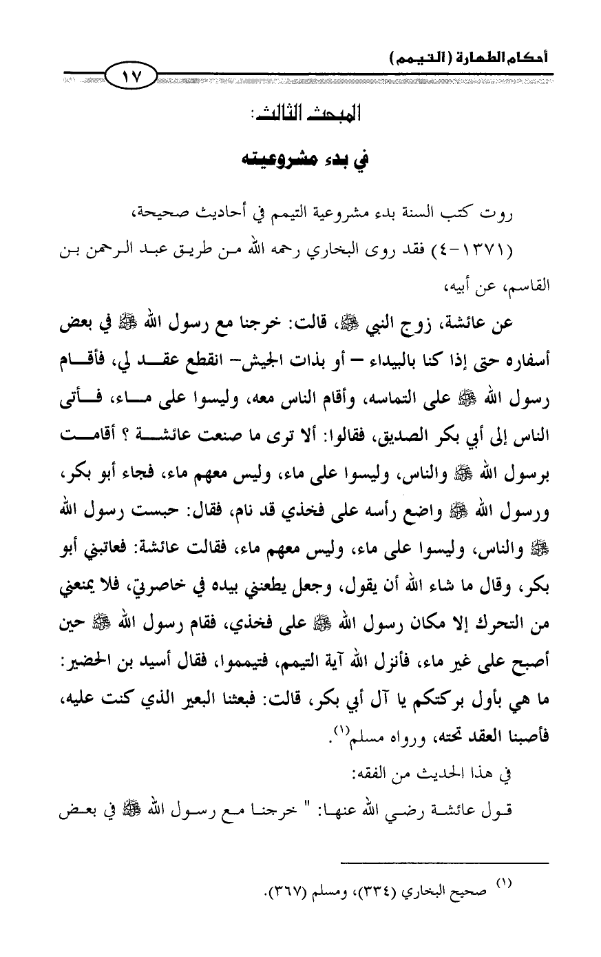 عن عائشة، زوج النبي - صلى الله عليه وسلم -، قالت: خرجنا مع رسول الله - صلى الله عليه وسلم - في بعض أسفاره حتى إذا كنا بالبيداء - أو بذات الجيش- انقطع عقد لي، فأقام رسول الله - صلى الله عليه وسلم - على التماسه، وأقام الناس معه، وليسوا على ماء، فأتى الناس إلى أبي بكر الصديق، فقالوا: ألا ترى ما صنعت عائشة؟ أقامت برسول الله - صلى الله عليه وسلم - والناس، وليسوا على ماء، وليس معهم ماء، فجاء أبو بكر، ورسول الله - صلى الله عليه وسلم - واضع رأسه على فخذي قد نام، فقال: حبست رسول الله - صلى الله عليه وسلم - والناس، وليسوا على ماء، وليس معهم ماء، فقالت عائشة: فعاتبني أبو بكر، وقال ما شاء الله أن يقول، وجعل يطعنني بيده في خاصرتي، فلا يمنعني من التحرك إلا مكان رسول الله - صلى الله عليه وسلم - على فخذي، فقام رسول الله - صلى الله عليه وسلم - حين أصبح على غير ماء، فأنزل الله آية التيمم، فتيمموا، فقال أسيد بن الحضير: ما هي بأول بركتكم يا آل أبي بكر، قالت: فبعثنا البعير الذي كنت عليه، فأصبنا العقد تحته، ورواه مسلم (¬١).