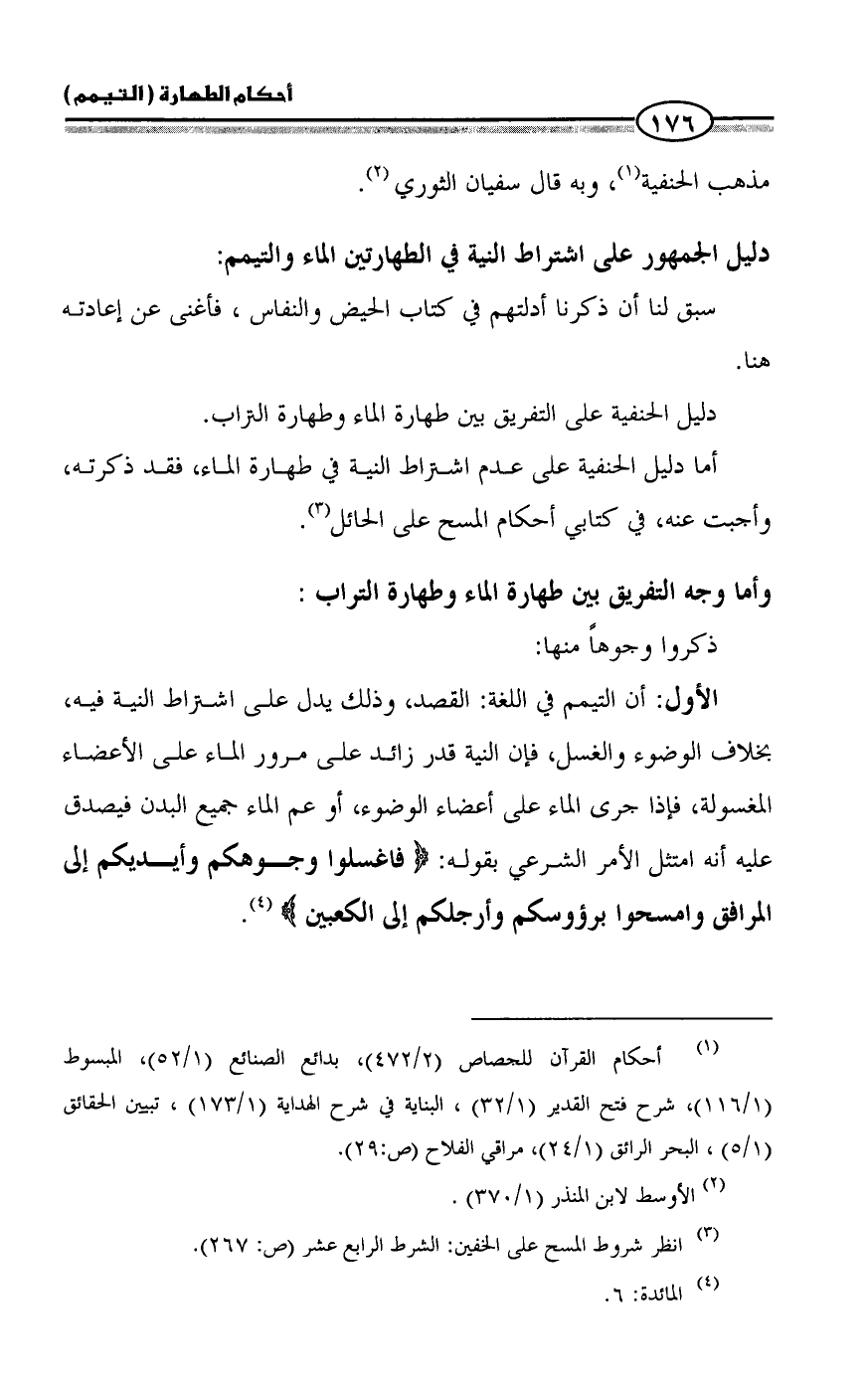 (¬١) أحكام القرآن للجصاص (٢/ ٤٧٢)، بدائع الصنائع (١/ ٥٢)، المبسوط (١/ ١١٦)، شرح فتح القدير (١/ ٣٢)، البناية في شرح الهداية (١/ ١٧٣)، تبيين الحقائق (١/ ٥)، البحر الرائق (١/ ٢٤)، مراقي الفلاح (ص:٢٩).