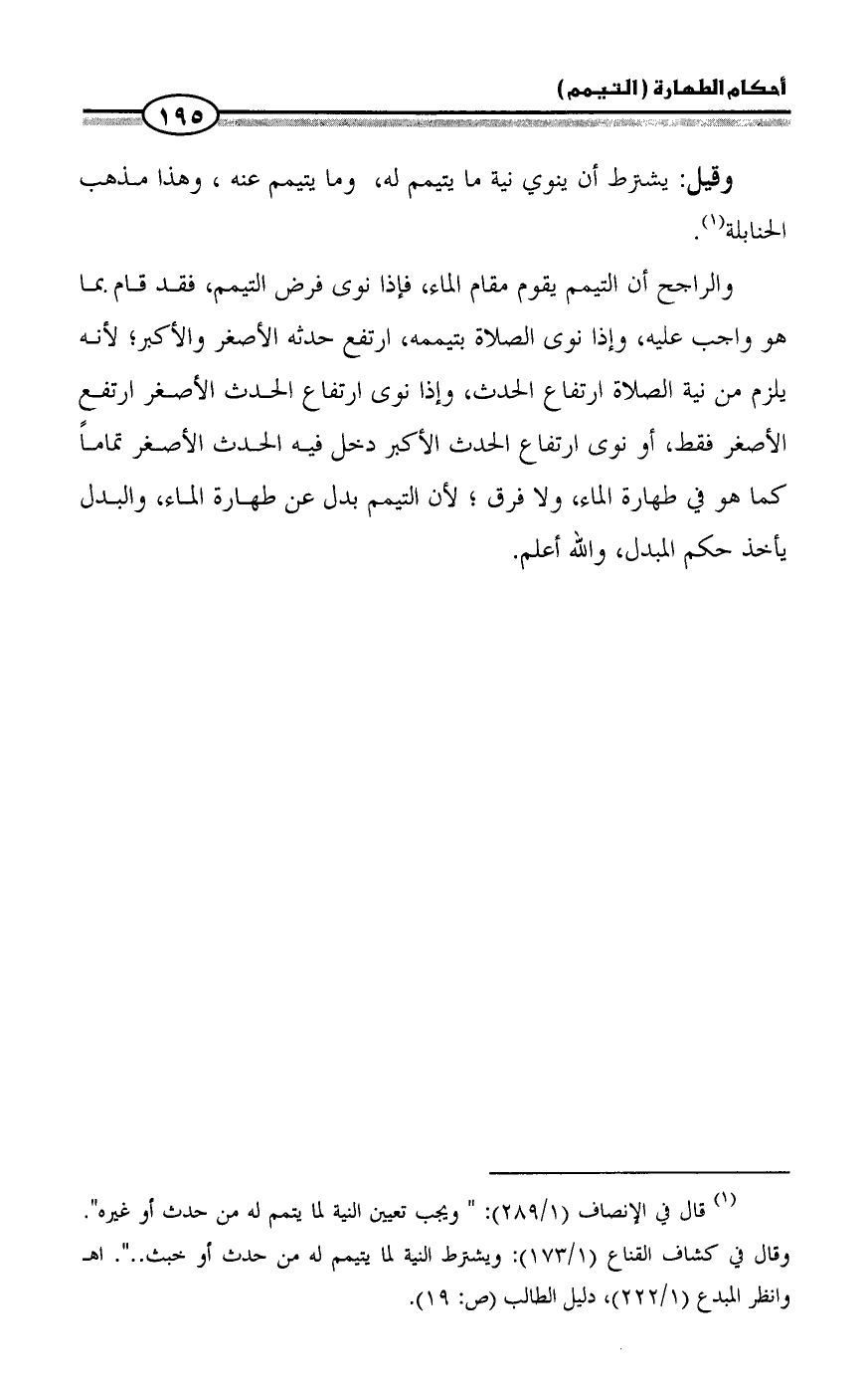 (¬١) قال في الإنصاف (١/ ٢٨٩): " ويجب تعيين النية لما يتمم له من حدث أو غيره". وقال في كشاف القناع (١/ ١٧٣): ويشترط النية لما يتيمم له من حدث أو خبث .. ". اهـ وانظر المبدع (١/ ٢٢٢)، دليل الطالب (ص: ١٩).