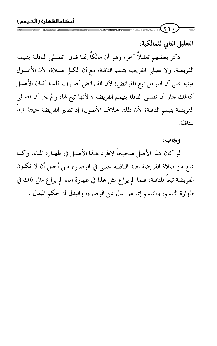 ذكر بعضهم تعليلاً آخر، وهو أن مالكاً إنما قال: تصلى النافلة بتيمم الفريضة، ولا تصلى الفريضة بتيمم النافلة، مع أن الكل صلاة؛ لأن الأصول مبنية على أن النوافل تبع للفرائض؛ لأن الفرائض أصول، فلما كان الأصل كذلك جاز أن تصلى النافلة بتيمم الفريضة؛ لأنها تبع لها، ولم يجز أن تصلى الفريضة بتيمم النافلة؛ لأن ذلك خلاف الأصول؛ إذ تصير الفريضة حينئذ تبعاً للنافلة.