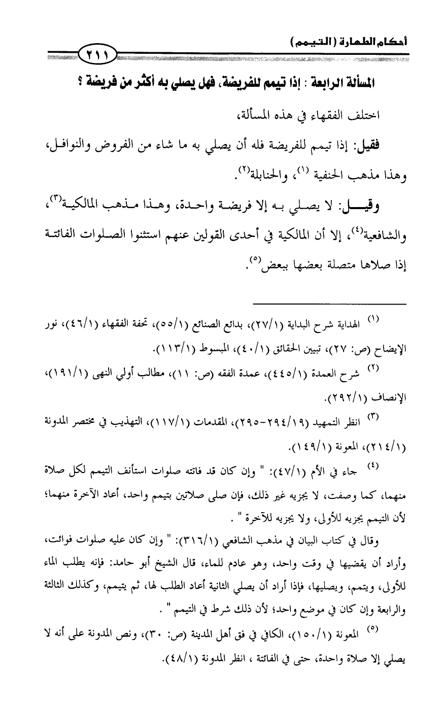(¬٥) المعونة (١/ ١٥٠)، الكافي في فق أهل المدينة (ص: ٣٠)، ونص المدونة على أنه لا يصلي إلا صلاة واحدة، حتى في الفائتة، انظر المدونة (١/ ٤٨).