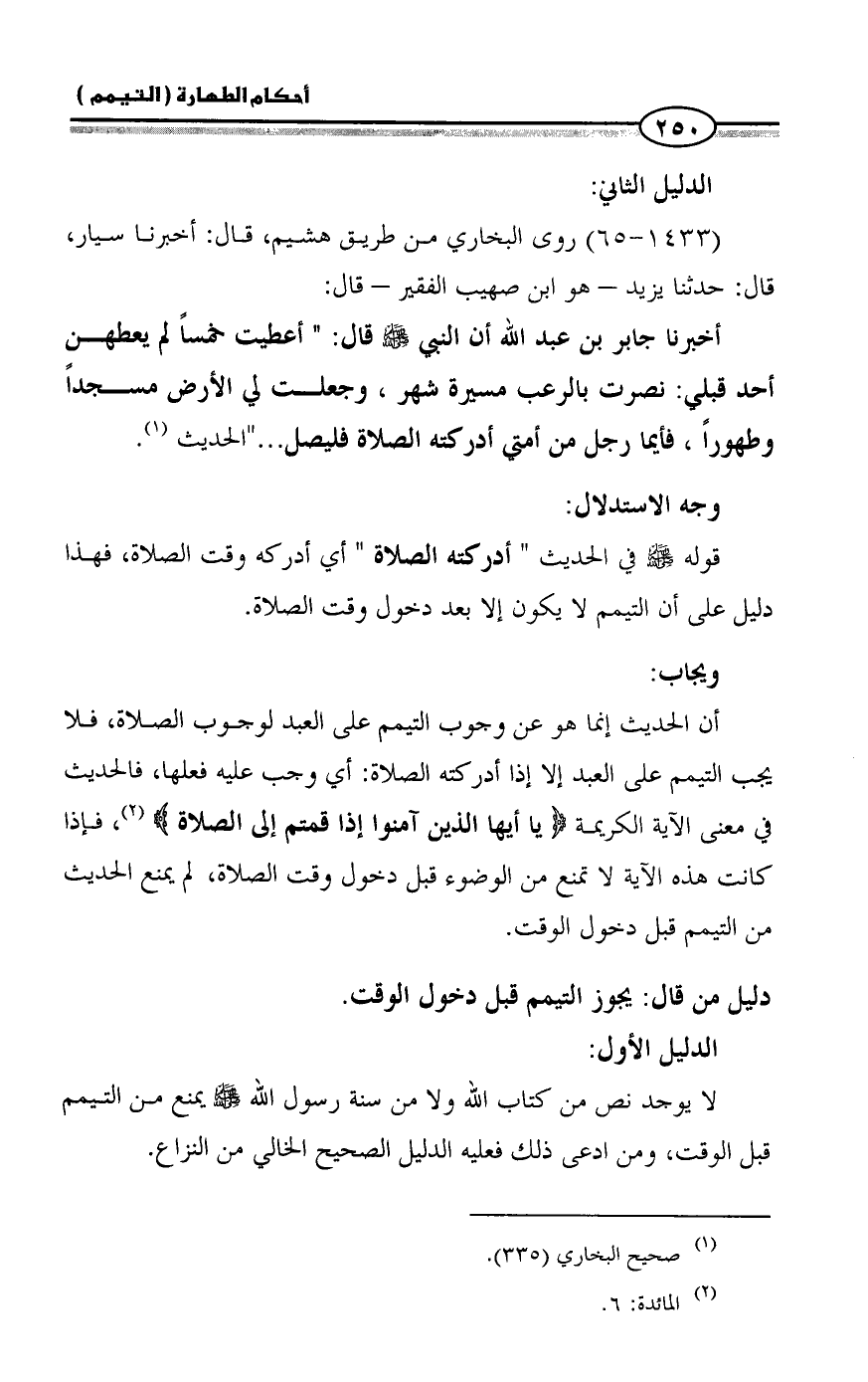 أخبرنا جابر بن عبد الله أن النبي - صلى الله عليه وسلم - قال: " أعطيت خمساً لم يعطهن أحد قبلي: نصرت بالرعب مسيرة شهر، وجعلت لي الأرض مسجداً وطهوراً، فأيما رجل من أمتي أدركته الصلاة فليصل ... "الحديث (¬١).
