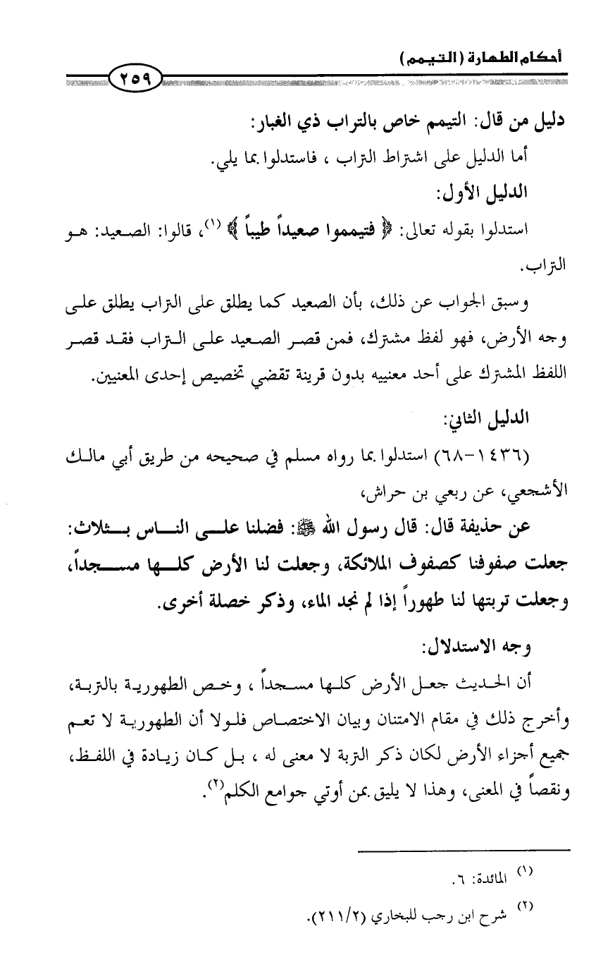وسبق الجواب عن ذلك، بأن الصعيد كما يطلق على التراب يطلق على وجه الأرض، فهو لفظ مشترك، فمن قصر الصعيد على التراب فقد قصر اللفظ المشترك على أحد معنييه بدون قرينة تقضي تخصيص إحدى المعنيين.