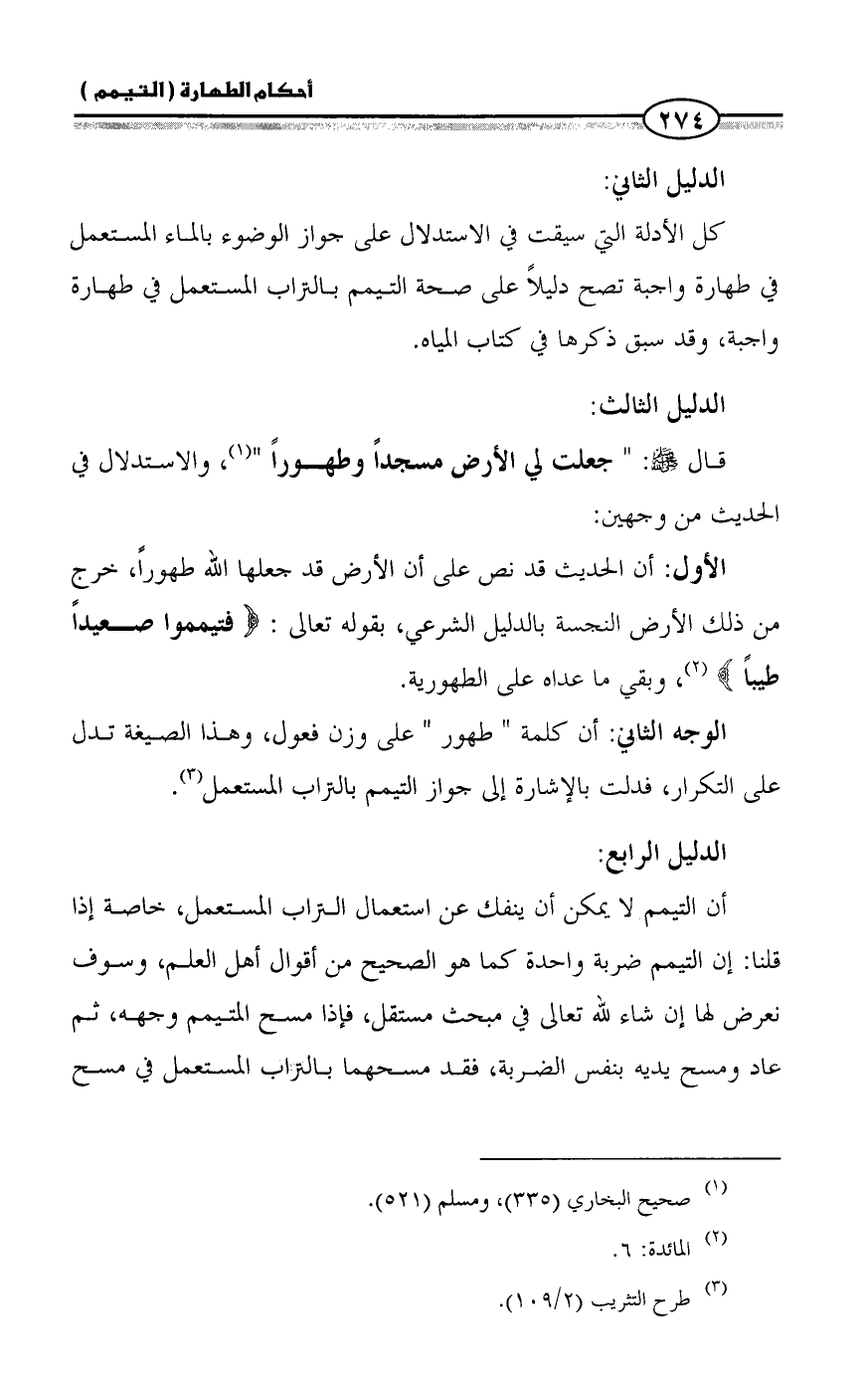 قال - صلى الله عليه وسلم -: " جعلت لي الأرض مسجداً وطهوراً " (¬١)، والاستدلال في الحديث من وجهين: