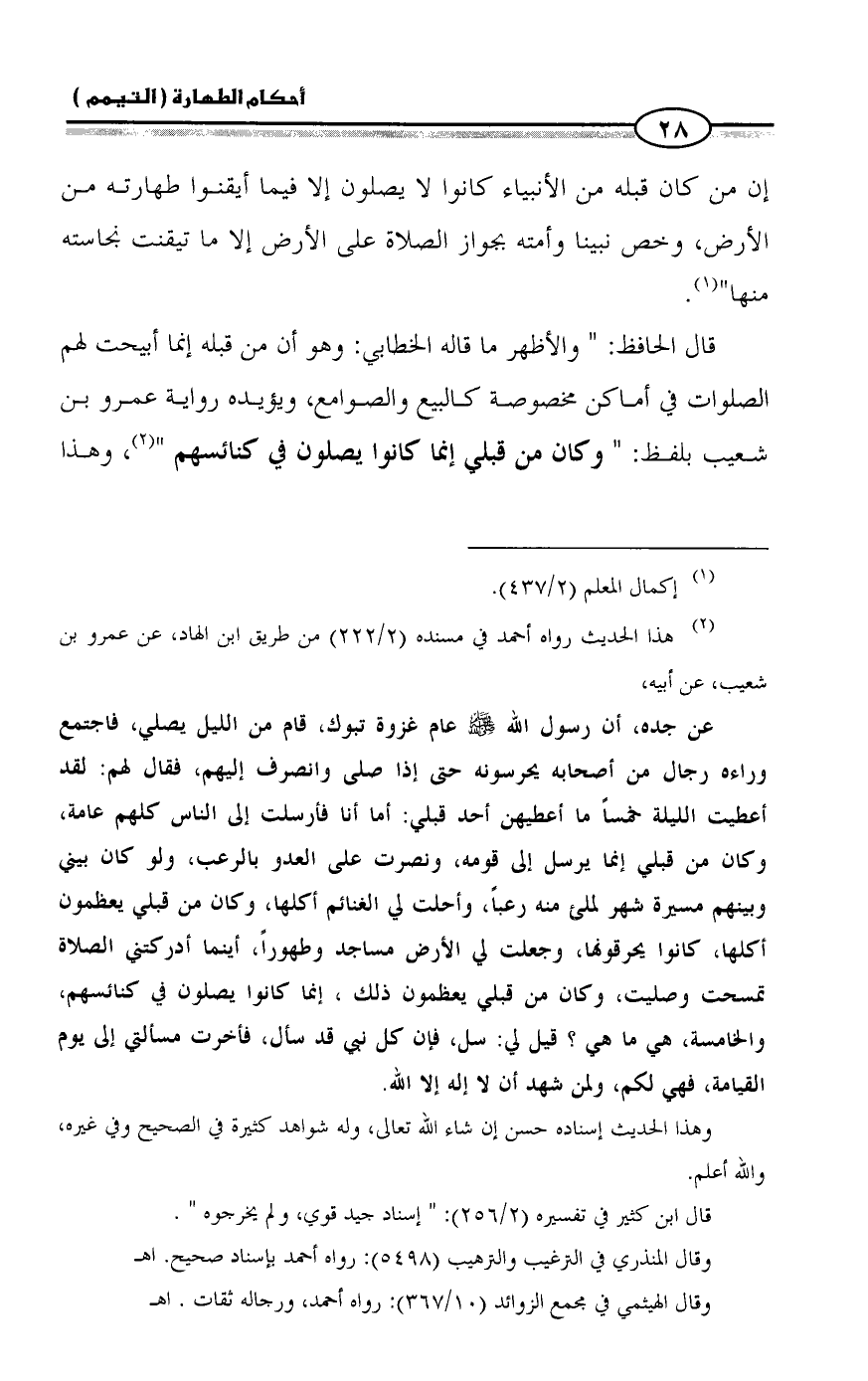 قال الحافظ: " والأظهر ما قاله الخطابي: وهو أن من قبله إنما أبيحت لهم الصلوات في أماكن مخصوصة كالبيع والصوامع، ويؤيده رواية عمرو بن شعيب بلفظ: " وكان من قبلي إنما كانوا يصلون في كنائسهم " (¬٢)، وهذا