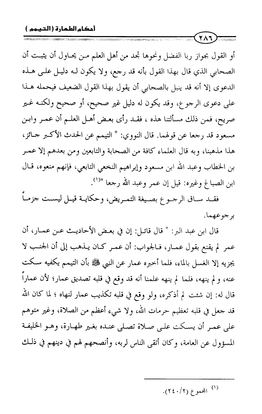 أو القول بجواز ربا الفضل ونحوها تجد من أهل العلم من يحاول أن يثبت أن الصحابي الذي قال بهذا القول بأنه قد رجع، ولا يكون له دليل على هذه الدعوى إلا أنه قد ينبل بالصحابي أن يقول بهذا القول الضعيف فيحمله هذا على دعوى الرجوع، وقد يكون له دليل غير صحيح، أو صحيح ولكنه غير صريح، فمن ذلك مسألتنا هذه، فقد رأى بعض أهل العلم أن عمر وابن مسعود قد رجعا عن قولهما. قال النووي: " التيمم عن الحدث الأكبر جائز، هذا مذهبنا، وبه قال العلماء كافة من الصحابة والتابعين ومن بعدهم إلا عمر بن الخطاب وعبد الله ابن مسعود وإبراهيم النخعي التابعي، فإنهم منعوه، قال ابن الصباغ وغيره: قيل إن عمر وعبد الله رجعا " (¬١).