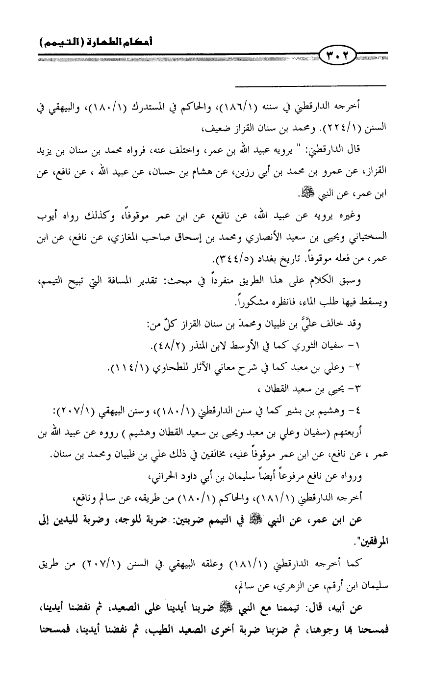 عن ابن عمر، عن النبي - صلى الله عليه وسلم - في التيمم ضربتين: ضربة للوجه، وضربة لليدين إلى المرفقين".