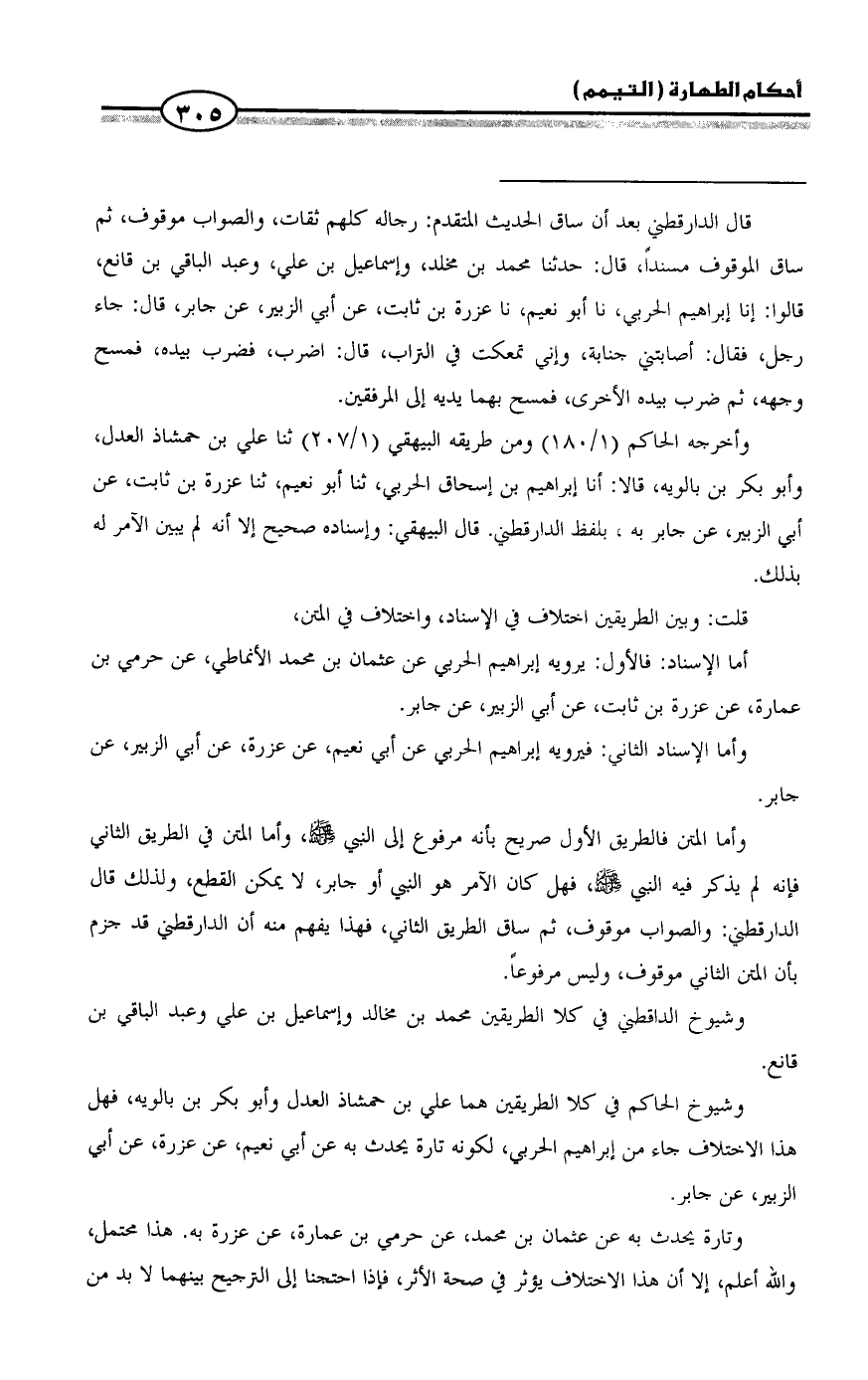 = قال الدارقطني بعد أن ساق الحديث المتقدم: رجاله كلهم ثقات، والصواب موقوف، ثم ساق الموقوف مسنداً، قال: حدثنا محمد بن مخلد، وإسماعيل بن علي، وعبد الباقي بن قانع، قالوا: إنا إبراهيم الحربي، نا أبو نعيم، نا عزرة بن ثابت، عن أبي الزبير، عن جابر، قال: جاء رجل، فقال: أصابتني جنابة، وإني تمعكت في التراب، قال: اضرب، فضرب بيده، فمسح وجهه، ثم ضرب بيده الأخرى، فمسح بهما يديه إلى المرفقين.