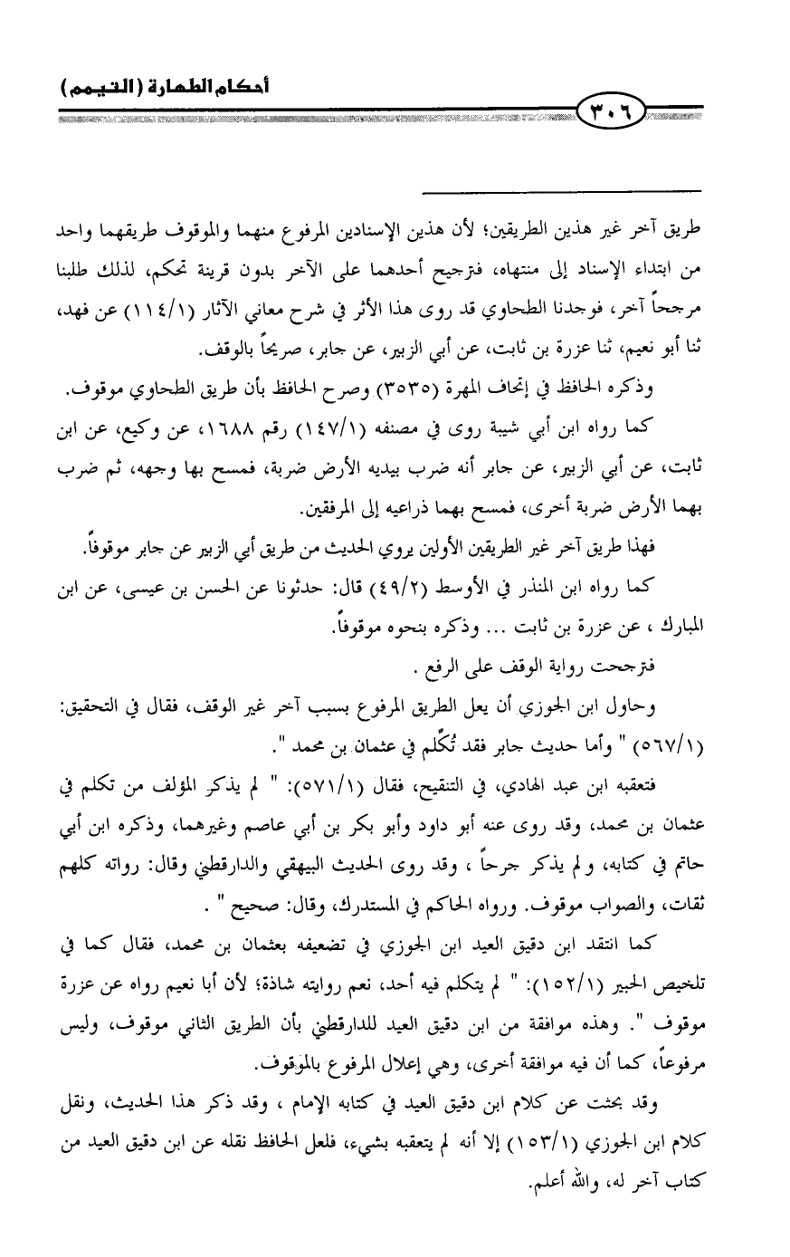 كما انتقد ابن دقيق العيد ابن الجوزي في تضعيفه بعثمان بن محمد، فقال كما في تلخيص الحبير (١/ ١٥٢): " لم يتكلم فيه أحد، نعم روايته شاذة؛ لأن أبا نعيم رواه عن عزرة موقوف ". وهذه موافقة من ابن دقيق العيد للدارقطني بأن الطريق الثاني موقوف، وليس مرفوعاً، كما أن فيه موافقة أخرى، وهي إعلال المرفوع بالموقوف.