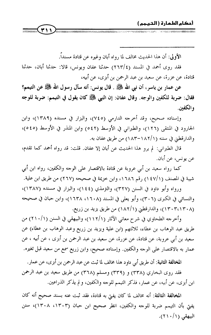 وأخرجه الطحاوي في شرح معاني الآثار (١/ ١١٢)، والبيهقي في السنن (١/ ٢١٠) من طريق عبد الوهاب بن عطاء، ثلاثتهم (ابن علية ويزيد بن زريع وعبد الوهاب بن عطاء) عن سعيد بن أبي عروبة، عن قتادة، عن عزرة، عن سعيد بن عبد الرحمن بن أبزى، عن أبيه، عن عمار به بالاقتصار على الوجه والكفين. وإسناده صحيح، وابن زريع سمع من سعيد قبل تغيره.