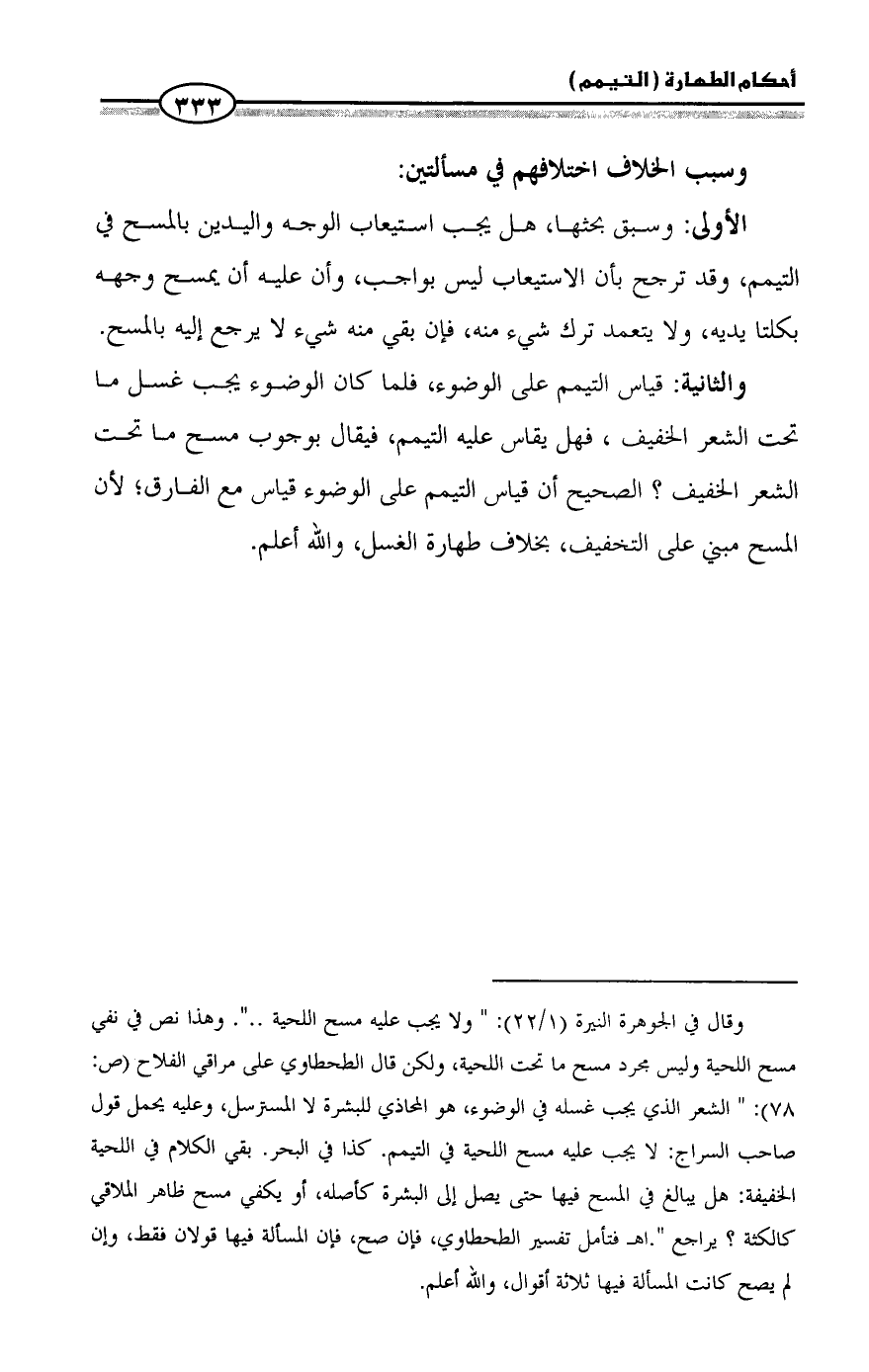 والثانية: قياس التيمم على الوضوء، فلما كان الوضوء يجب غسل ما تحت الشعر الخفيف، فهل يقاس عليه التيمم، فيقال بوجوب مسح ما تحت الشعر الخفيف؟ الصحيح أن قياس التيمم على الوضوء قياس مع الفارق؛ لأن المسح مبني على التخفيف، بخلاف طهارة الغسل، والله أعلم.
