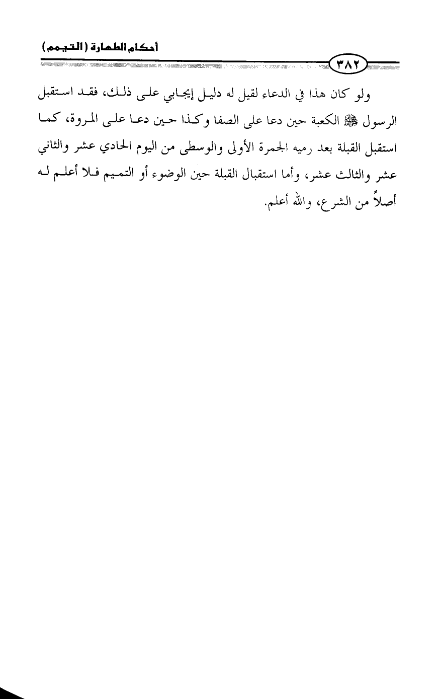 ولو كان هذا في الدعاء لقيل له دليل إيجابي على ذلك، فقد استقبل الرسول - صلى الله عليه وسلم - الكعبة حين دعا على الصفا وكذا حين دعا على المروة، كما استقبل القبلة بعد رميه الجمرة الأولى والوسطى من اليوم الحادي عشر والثاني عشر والثالث عشر، وأما استقبال القبلة حين الوضوء أو التميم فلا أعلم له أصلاً من الشرع، والله أعلم.