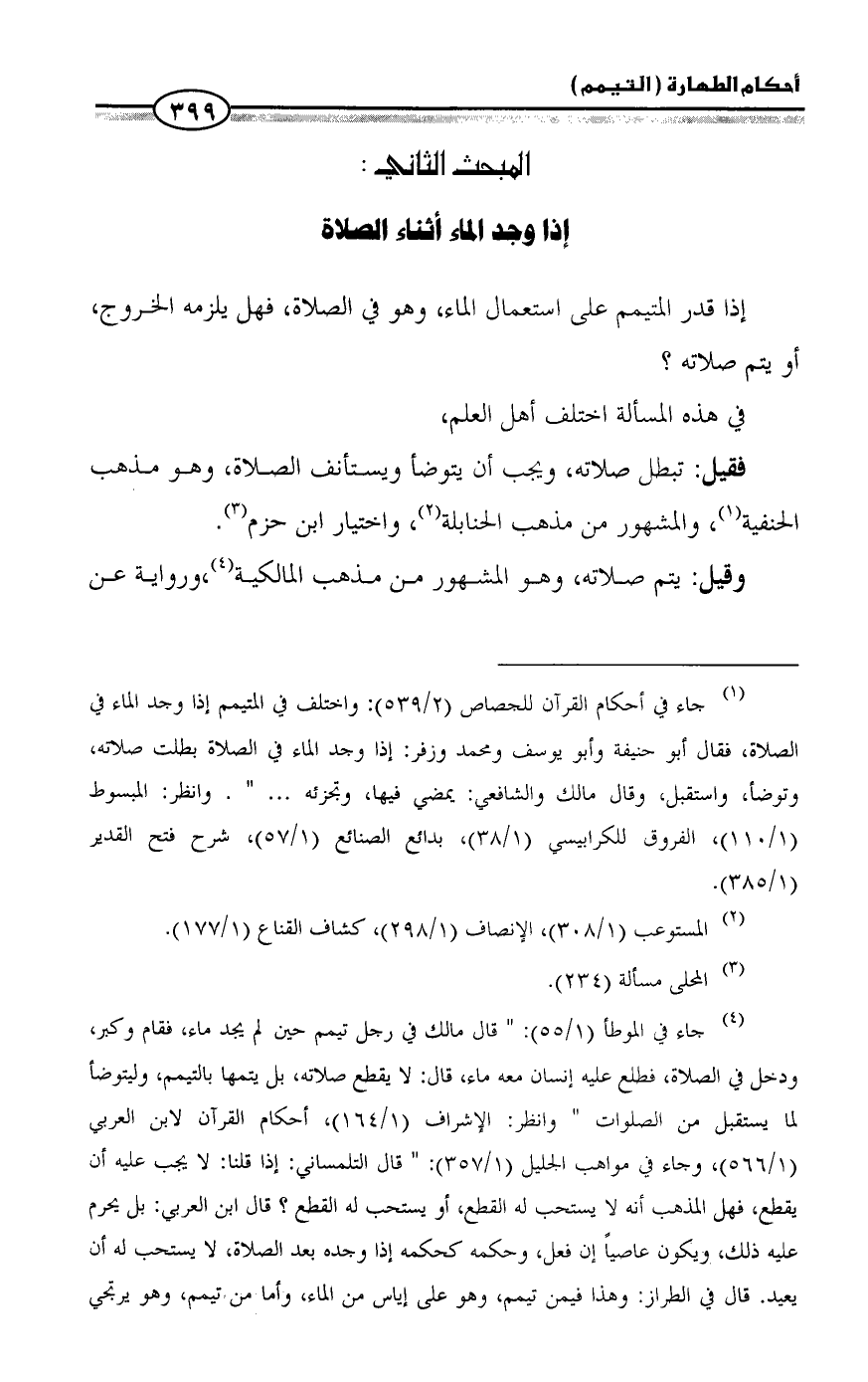 (¬٤) جاء في الموطأ (١/ ٥٥): " قال مالك في رجل تيمم حين لم يجد ماء، فقام وكبر، ودخل في الصلاة، فطلع عليه إنسان معه ماء، قال: لا يقطع صلاته، بل يتمها بالتيمم، وليتوضأ لما يستقبل من الصلوات " وانظر: الإشراف (١/ ١٦٤)، أحكام القرآن لابن العربي (١/ ٥٦٦)، وجاء في مواهب الجليل (١/ ٣٥٧): " قال التلمساني: إذا قلنا: لا يجب عليه أن يقطع، فهل المذهب أنه لا يستحب له القطع، أو يستحب له القطع؟ قال ابن العربي: بل يحرم عليه ذلك، ويكون عاصياً إن فعل، وحكمه كحكمه إذا وجده بعد الصلاة، لا يستحب له أن يعيد. قال في الطراز: وهذا فيمن تيمم، وهو على إياس من الماء، وأما من تيمم، وهو يرتجي =