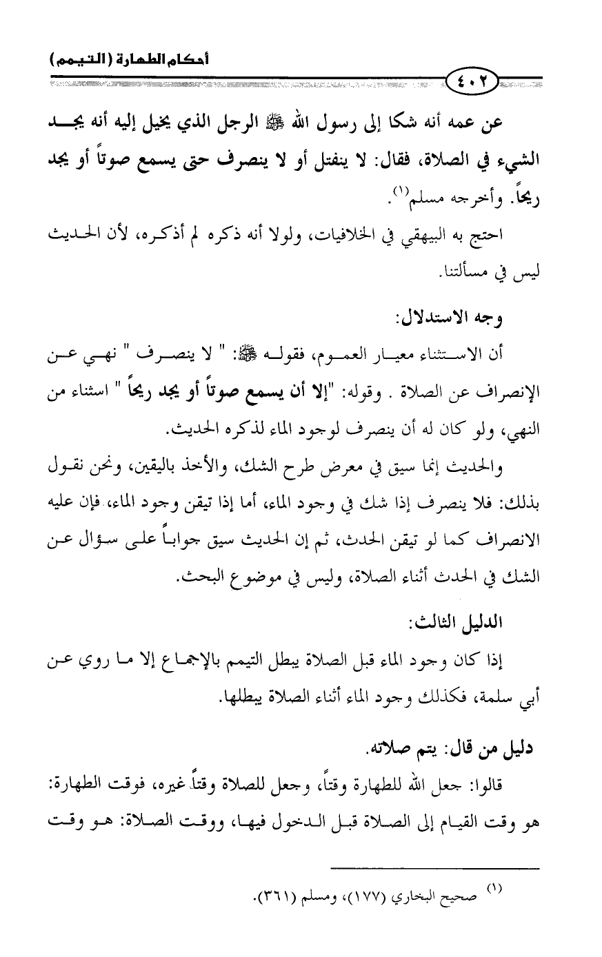 أن الاستثناء معيار العموم، فقوله - صلى الله عليه وسلم -: " لا ينصرف " نهي عن الإنصراف عن الصلاة. وقوله: "إلا أن يسمع صوتاً أو يجد ريحاً " اسثناء من النهي، ولو كان له أن ينصرف لوجود الماء لذكره الحديث.