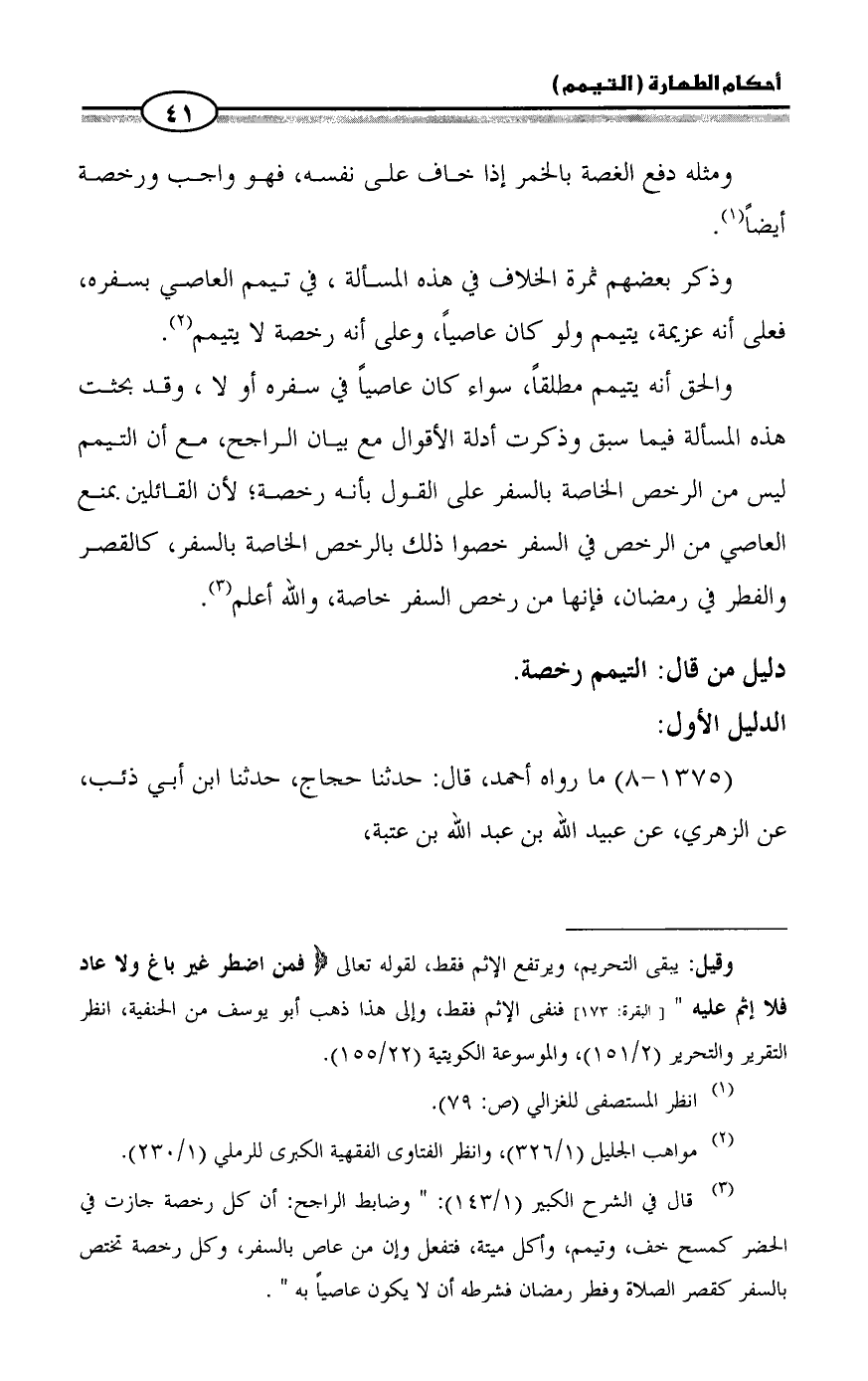 (¬٣) قال في الشرح الكبير (١/ ١٤٣): " وضابط الراجح: أن كل رخصة جازت في الحضر كمسح خف، وتيمم، وأكل ميتة، فتفعل وإن من عاص بالسفر، وكل رخصة تختص بالسفر كقصر الصلاة وفطر رمضان فشرطه أن لا يكون عاصياً به ".