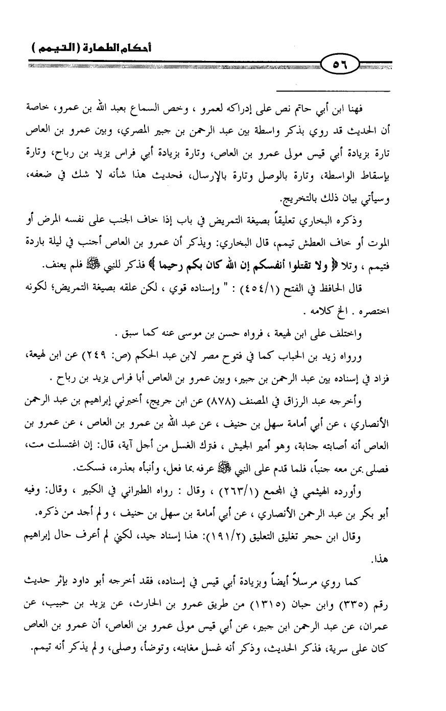 = فهنا ابن أبي حاتم نص على إدراكه لعمرو، وخص السماع بعبد الله بن عمرو، خاصة أن الحديث قد روي بذكر واسطة بين عبد الرحمن بن جبير المصري، وبين عمرو بن العاص تارة بزيادة أبي قيس مولى عمرو بن العاص، وتارة بزيادة أبي فراس يزيد بن رباح، وتارة بإسقاط الواسطة، وتارة بالوصل وتارة بالإرسال، فحديث هذا شأنه لا شك في ضعفه، وسيأتي بيان ذلك بالتخريج.