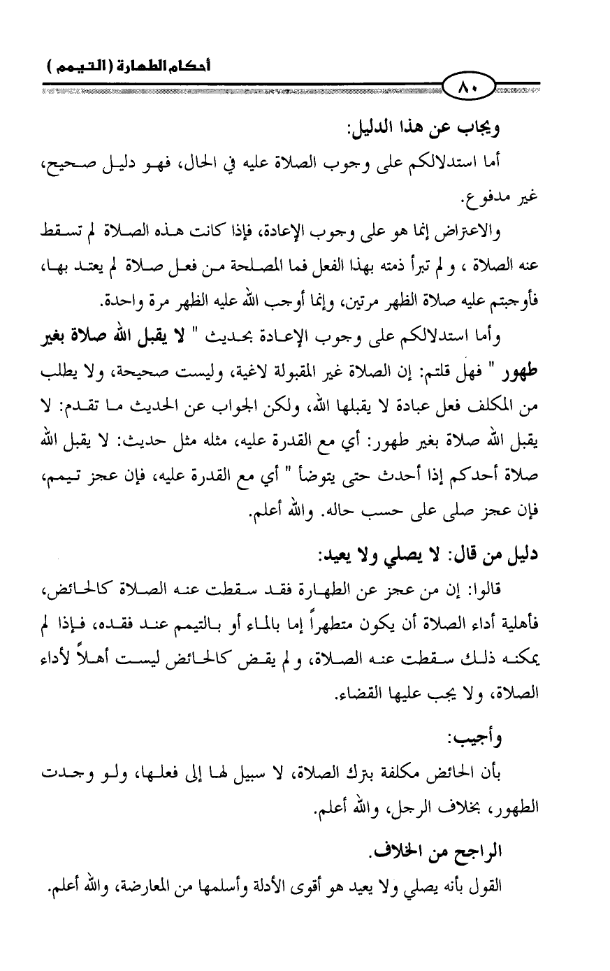 وأما استدلالكم على وجوب الإعادة بحديث " لا يقبل الله صلاة بغير طهور " فهل قلتم: إن الصلاة غير المقبولة لاغية، وليست صحيحة، ولا يطلب من المكلف فعل عبادة لا يقبلها الله، ولكن الجواب عن الحديث ما تقدم: لا يقبل الله صلاة بغير طهور: أي مع القدرة عليه، مثله مثل حديث: لا يقبل الله صلاة أحدكم إذا أحدث حتى يتوضأ " أي مع القدرة عليه، فإن عجز تيمم، فإن عجز صلى على حسب حاله. والله أعلم.