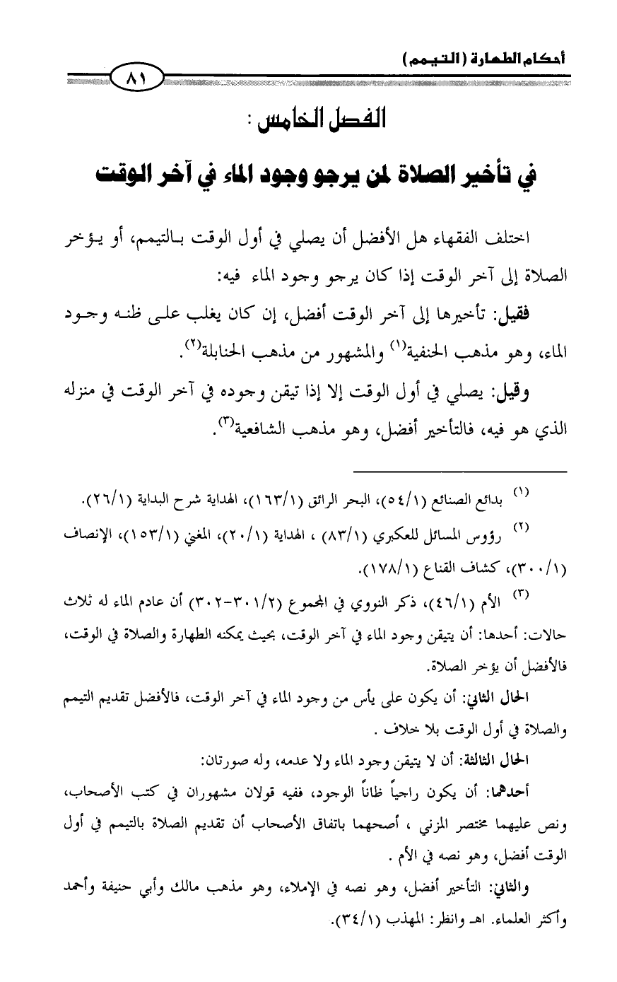 (¬٣) الأم (١/ ٤٦)، ذكر النووي في المجموع (٢/ ٣٠١ - ٣٠٢) أن عادم الماء له ثلاث حالات: أحدها: أن يتيقن وجود الماء في آخر الوقت، بحيث يمكنه الطهارة والصلاة في الوقت، فالأفضل أن يؤخر الصلاة.