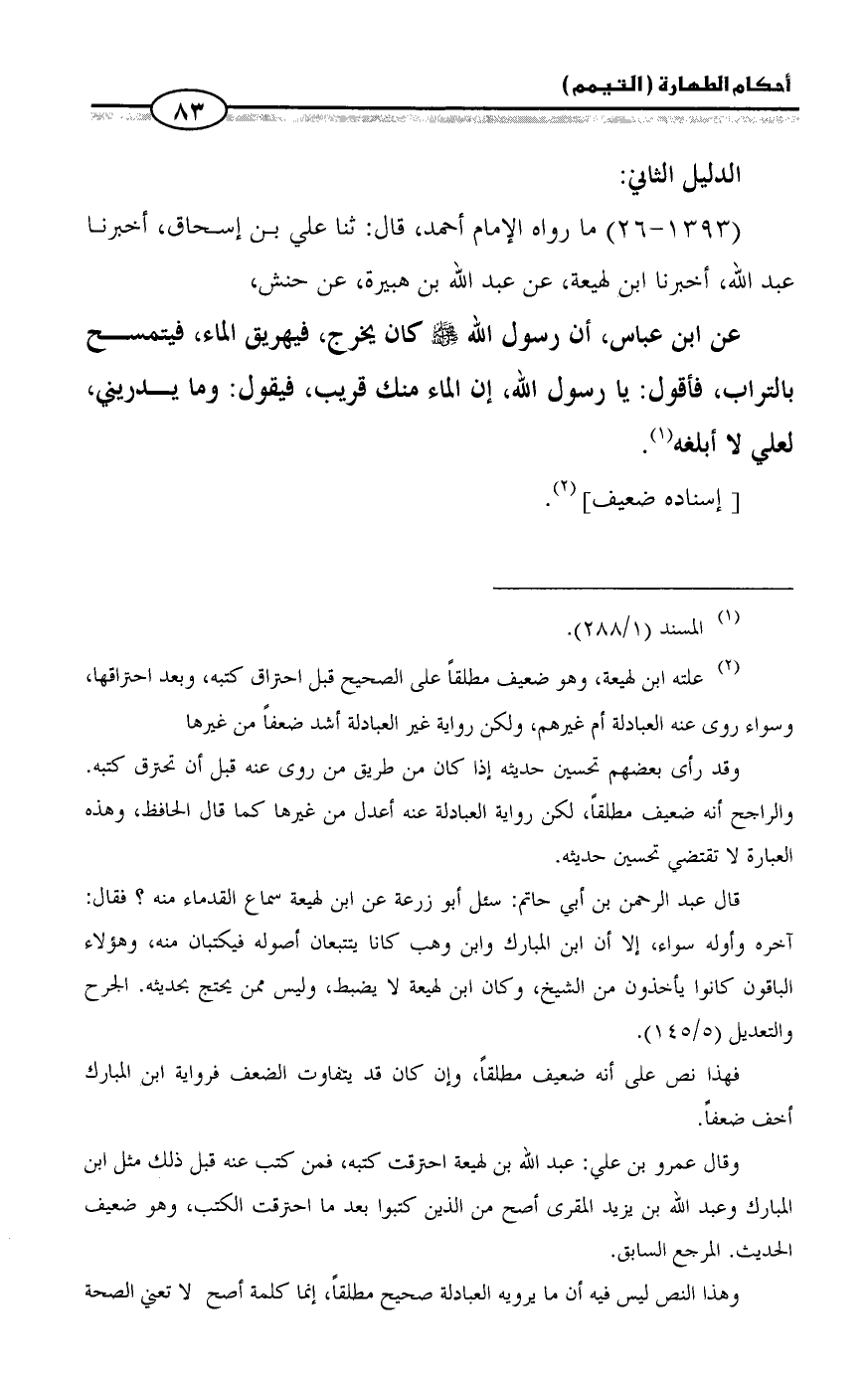 (¬٢) علته ابن لهيعة، وهو ضعيف مطلقاً على الصحيح قبل احتراق كتبه، وبعد احتراقها، وسواء روى عنه العبادلة أم غيرهم، ولكن رواية غير العبادلة أشد ضعفاً من غيرها