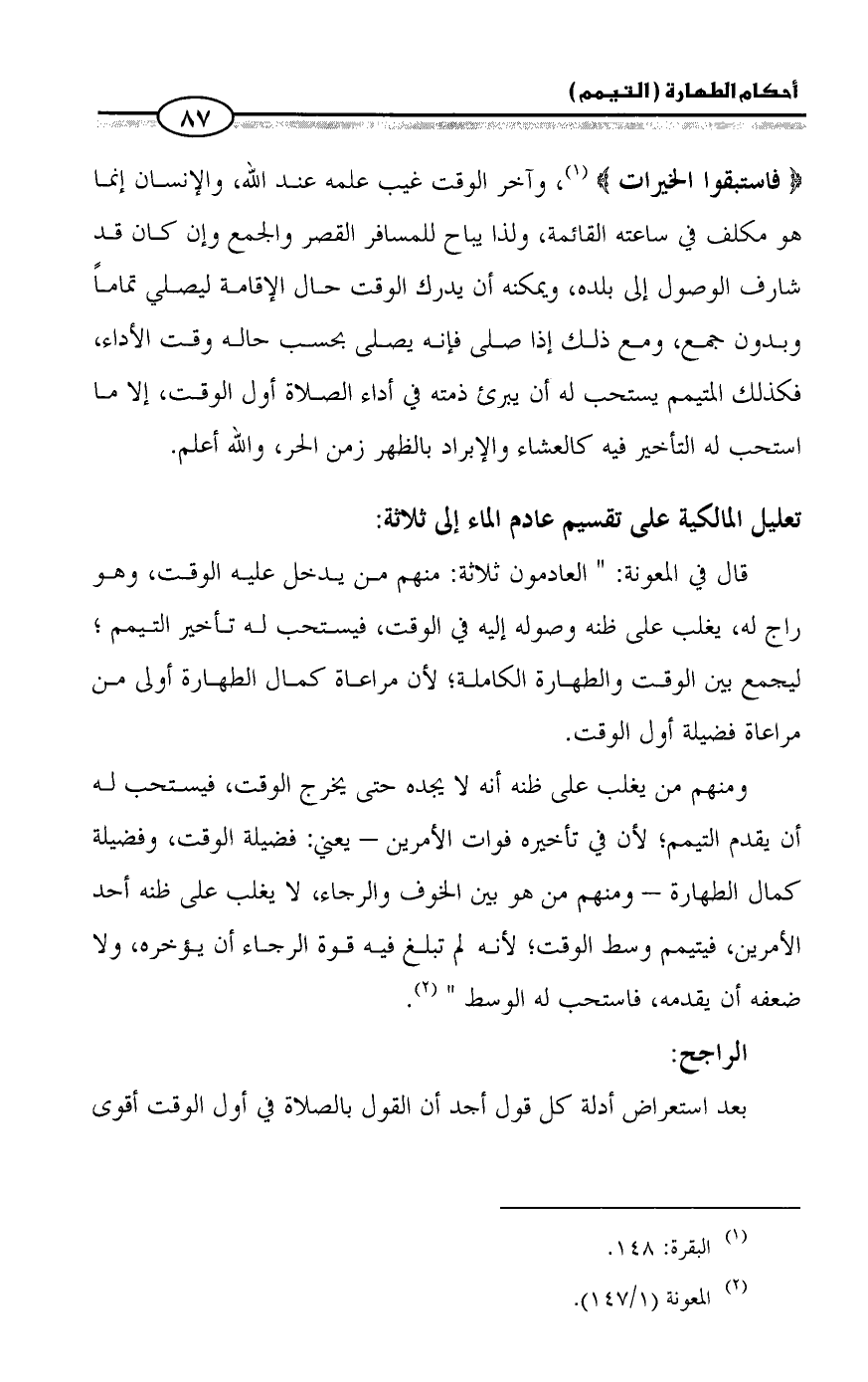 {فاستبقوا الخيرات} (¬١)، وآخر الوقت غيب علمه عند الله، والإنسان إنما هو مكلف في ساعته القائمة، ولذا يباح للمسافر القصر والجمع وإن كان قد شارف الوصول إلى بلده، ويمكنه أن يدرك الوقت حال الإقامة ليصلي تماماً وبدون جمع، ومع ذلك إذا صلى فإنه يصلى بحسب حاله وقت الأداء، فكذلك المتيمم يستحب له أن يبرئ ذمته في أداء الصلاة أول الوقت، إلا ما استحب له التأخير فيه كالعشاء والإبراد بالظهر زمن الحر، والله أعلم.