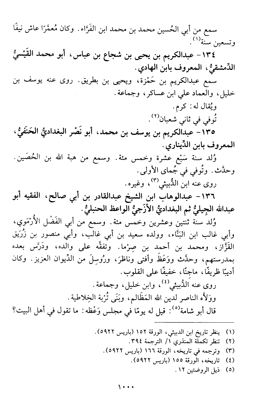 134 - عَبْد الكريم بْن يحيى بْن شُجاع بْن عَبَّاس، أبو مُحَمَّد القَيْسيّ الدَّمشقيّ، المعروف بابن الهادي. [المتوفى: 593 هـ]