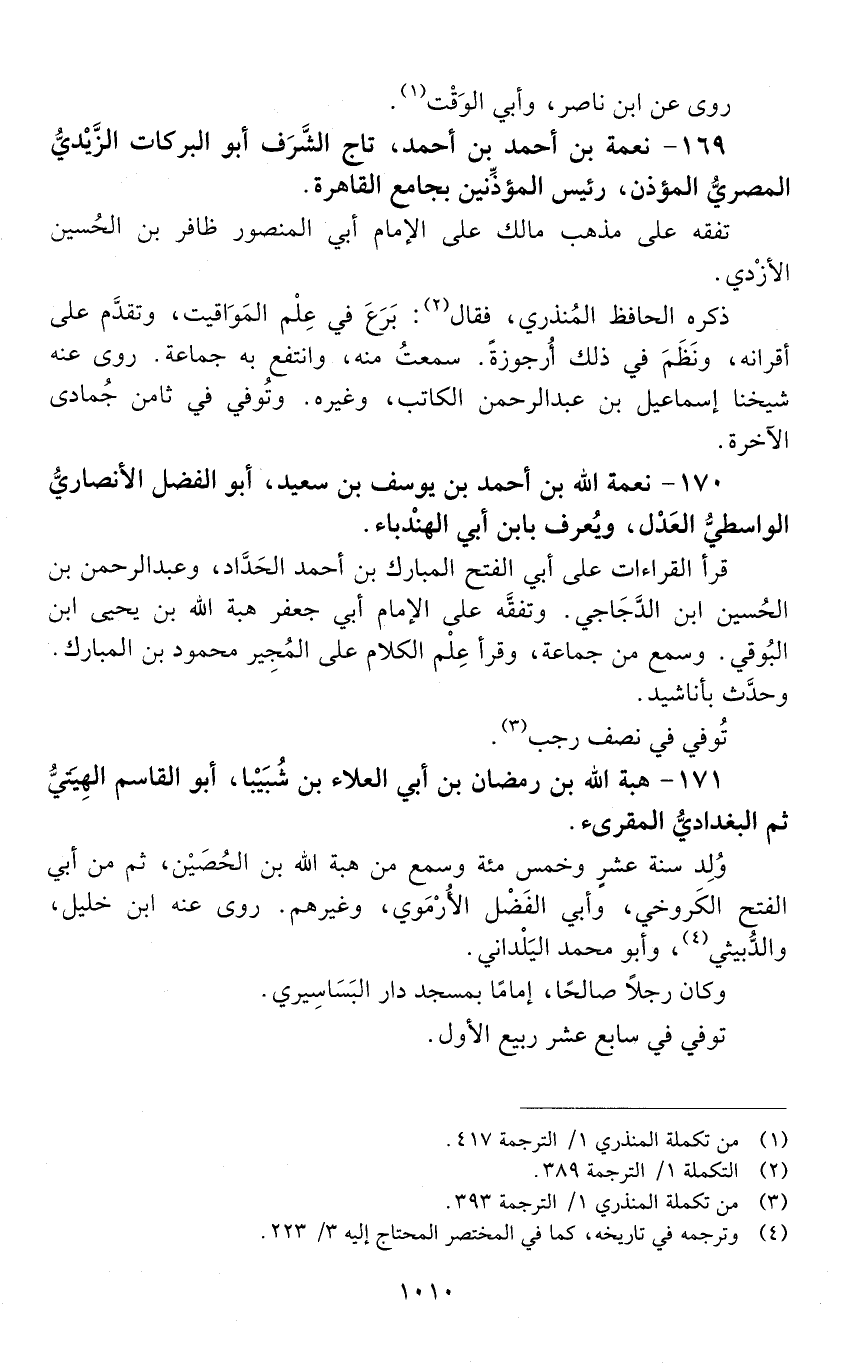 169 - نعمة بن أحمد بن أحمد. تاج الشرف، أبو البركات الزيدي، المصري، المؤذن. رئيس المؤذنين بجامع القاهرة. [المتوفى: 593 هـ]