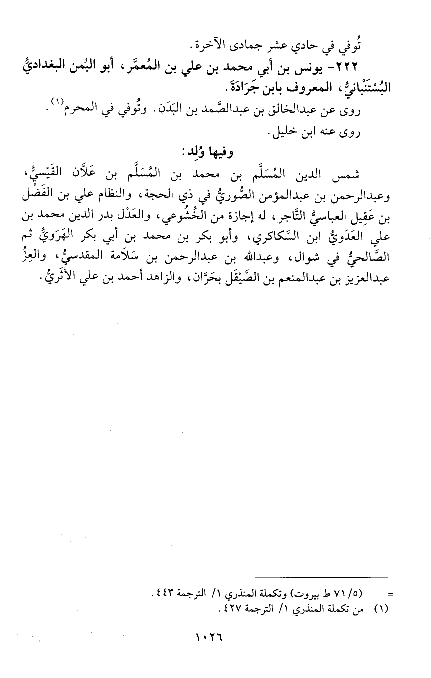 222 - يُونُس بْن أَبِي مُحَمَّد بْن علي بْن المعمر، أبو اليُمْن البغداديّ، البُسْتَنْبانيّ، المعروف بابن جَرَادَة. [المتوفى: 594 هـ]