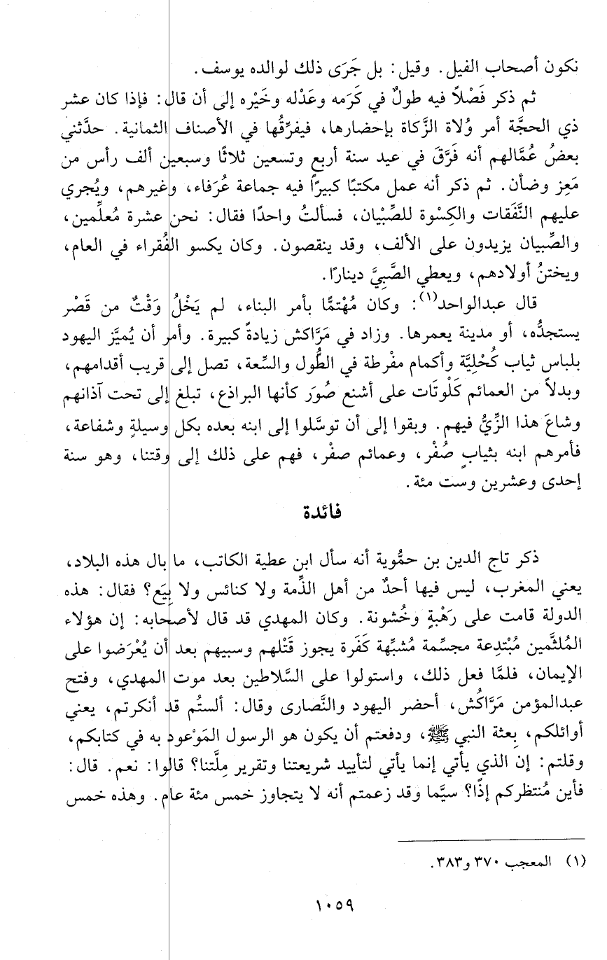 ذكر تاج الدّين بْن حَمُّوَيْه أنّه سَأَلَ ابن عطيَّة الكاتب: ما بال هَذِهِ البلاد، يعني المغرب، ليس فيها أحدٌ من أَهْل الذّمَّة ولا كنائس ولا بيَع؟ فقال: هَذِهِ الدّولة قامت على رهبةٍ وخُشونة. وكان المهديّ قد قال لأصحابه: إنّ هؤلاء الملثَّمين مبتدِعة مجسمة مشبِّهة كَفَرة، يجوز قتْلهم وسَبْيهم بعد أن يُعرضوا على الْإِيمَان. فلمّا فعل ذلك، واستولوا على السّلاطين بعد موت المهديّ، وفتح عَبْد المؤمن مَرّاكُش، أحضر اليهود والنّصارى، وقال: أَلَسْتُم قد أنكرتم، يعني أوائلكم، بعثة النَّبِيّ صلى الله عليه وسلم، ودفعتم أن يكون هُوَ الرَّسُول الموعود به فِي كتابكم، وقلتم: إنّ الّذي يأتي إنّما يأتي لتأييد شريعتنا وتقرير مِلّتنا؟ قَالُوا: نعم. قال: فأين منتظركم إذًا؟ سيما وقد زعمتم أنه لا يتجاوز خمسمائة عام. وهذه خمس -[1060]- مائة عام قد انقضت لِمِلّتنا، ولم يأتِ منكم بشير ولا نذير. ونحن لا نقركم على كُفركم، ولا لنا حاجة بجزيتكم، فإمّا الْإِسْلَام، وإمّا القتل.