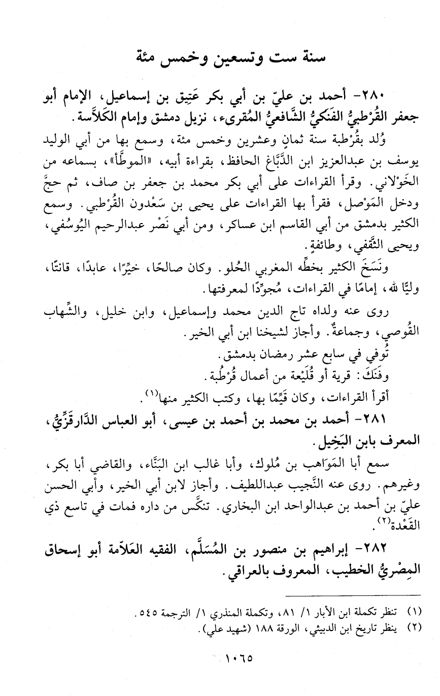 280 - أَحْمَد بْن عليّ بْن أَبِي بَكْر عتيق بْن إِسْمَاعِيل. الْإِمَام أبو جَعْفَر القُرطُبيّ، الفَنكيّ، الشّافعيّ، الْمُقْرِئ، [المتوفى: 596 هـ]