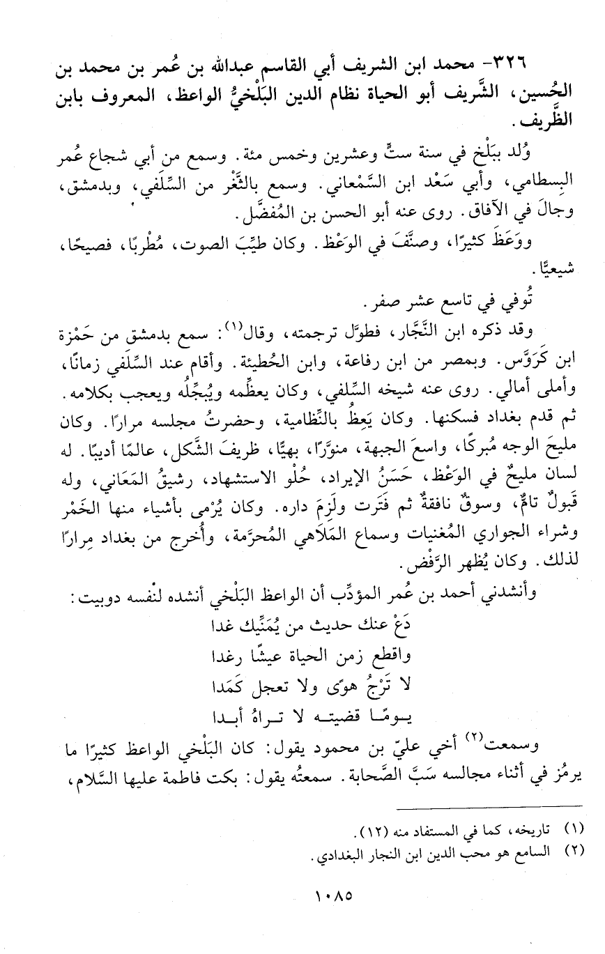 326 - محمد ابن الشّريف أَبِي القاسم عَبْد اللَّه بْن عُمَر بْن مُحَمَّد بْن الحسين. الشريف أبو الحياة نظام الدين البلخي، الواعظ، المعروف بابن الظّريف. [المتوفى: 596 هـ]