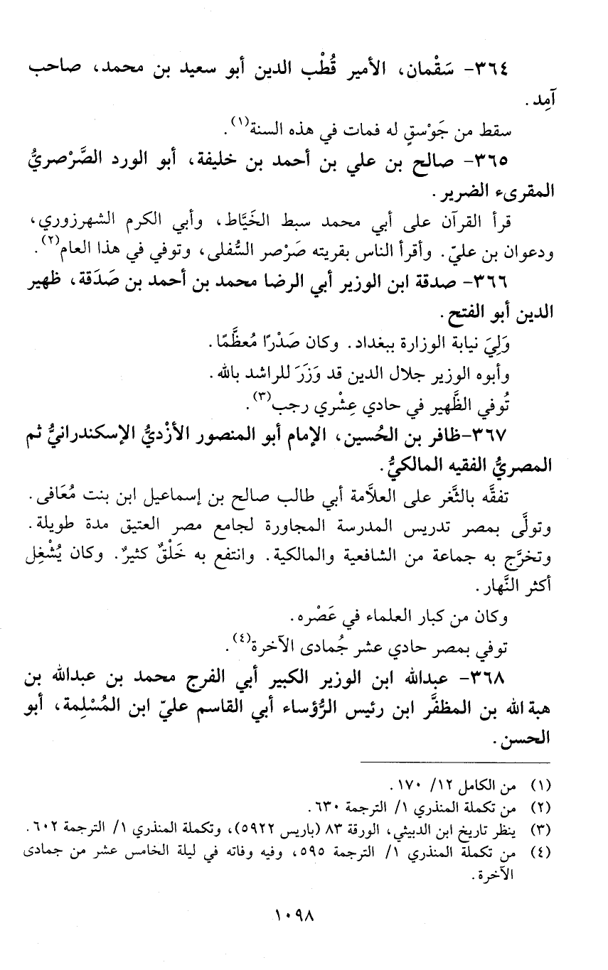 366 - صَدَقَة ابن الوزير أَبِي الرضا مُحَمَّد بْن أَحْمَد بْن صَدَقة، ظهير الدّين أبو الفتح. [المتوفى: 597 هـ]